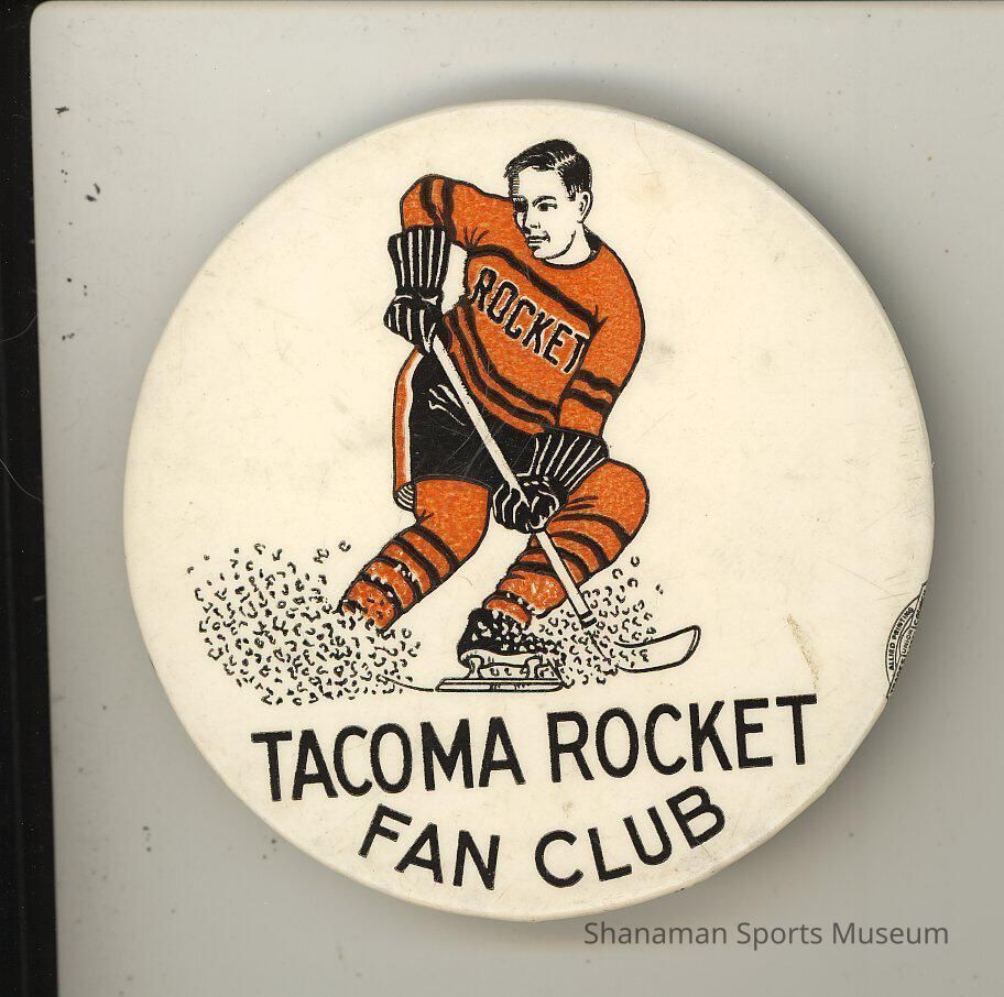 Button- Round, "TACOMA ROCKETS FAN CLUB", with drawing of a hockey player on the ice, wearing a Rockets jersey. The text and outline are black, and the player's uniform is orange. Button is from 1949.Lexicon