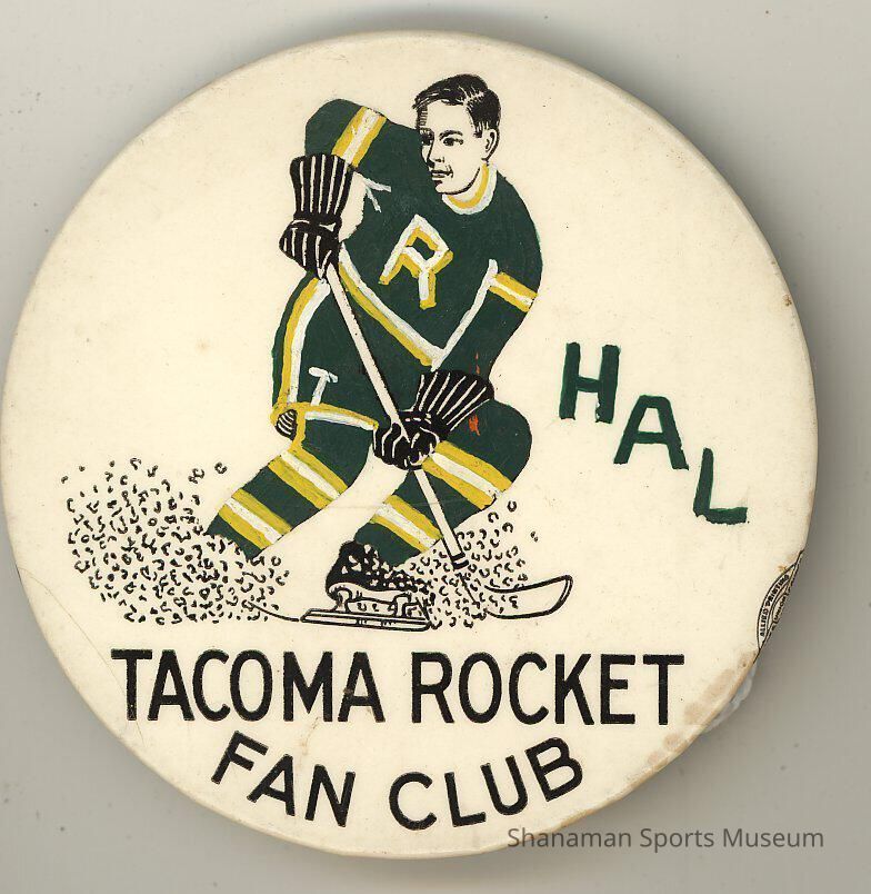 Button- Round, "TACOMA ROCKETS FAN CLUB", with drawing of a hockey player on the ice, wearing an "R" jersey and "HAL".Lexicon