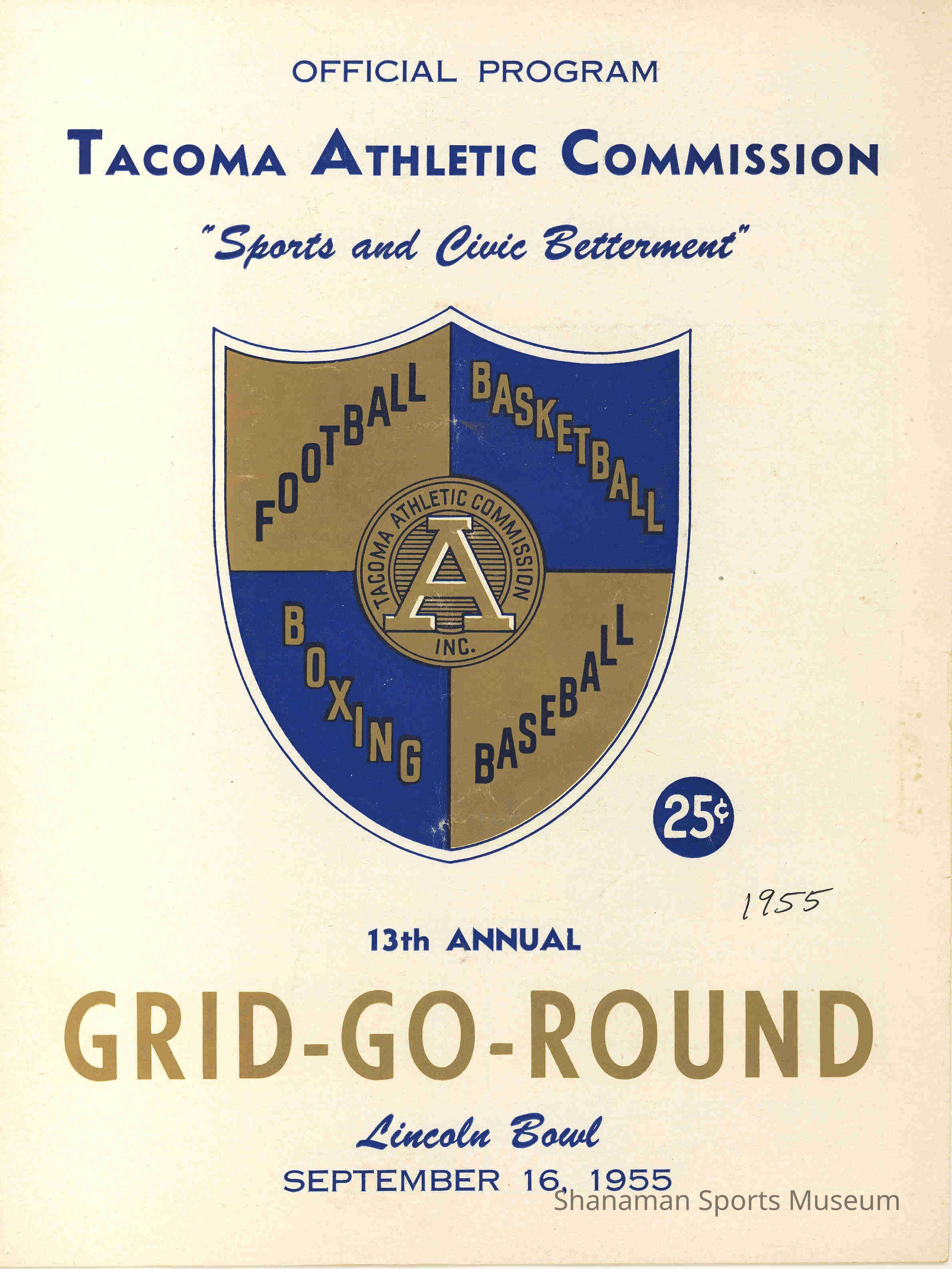 Program, 13th Annual Grid-Go-Round, Lincoln Bowl, Sept 16, 1955. Bellarmine, Clover Park, Stadium, Lincoln. Two tickets taped to inside front cover.Lexicon