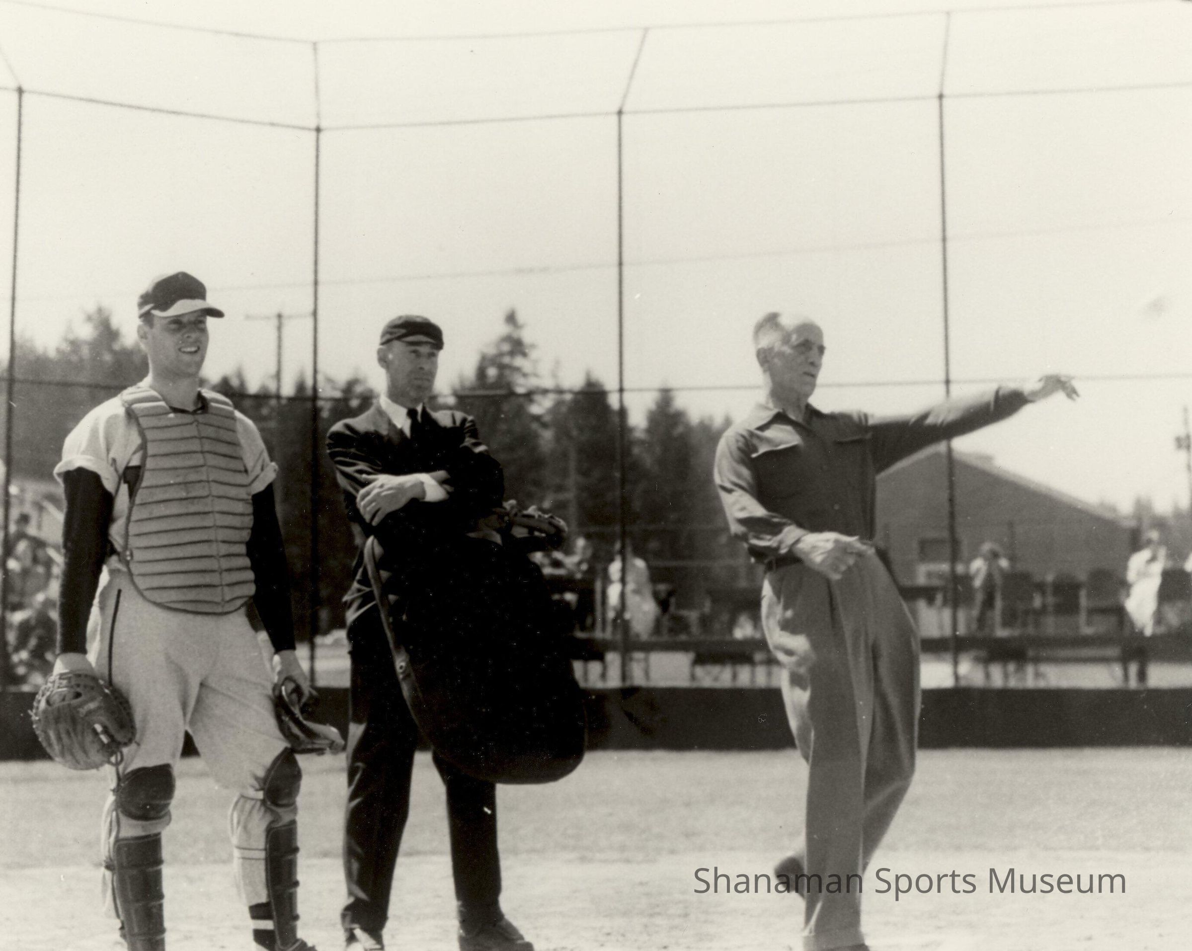 Noted Tacoma sports columnist Elliott Metcalf throws a baseball at a game shortly before he passed away in 1966. In an era before journalists were discouraged from being involved with community organizations, Metcalf was an original member of the Tacoma Athletic War Commission, which became the Tacoma Athletic Commission.Lexicon