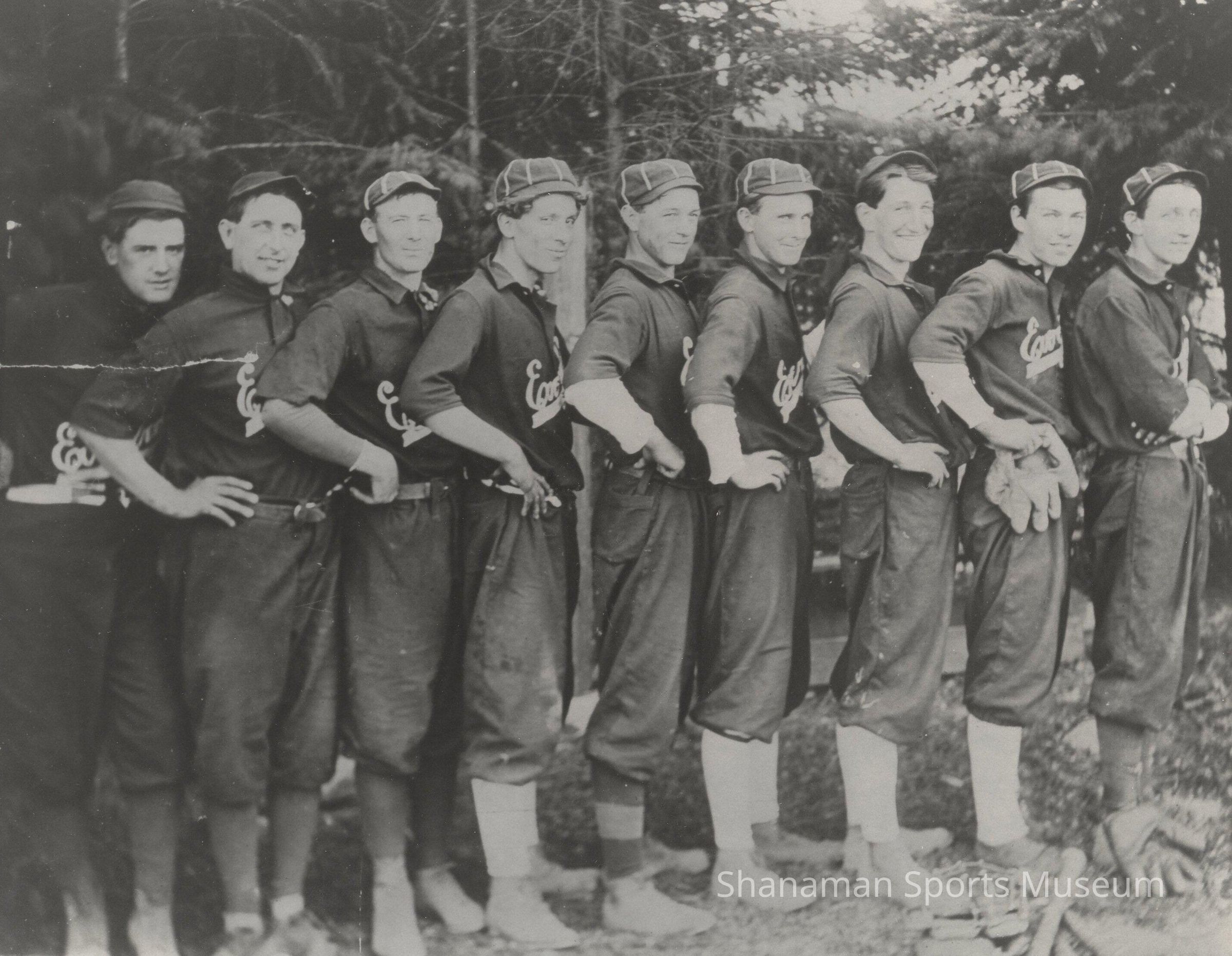 Nine baseball players wearing Eatonville uniforms pose for an undated photograph. Identified players are Lee Keppert, third from right, and Harry Keppert, right.Lexicon