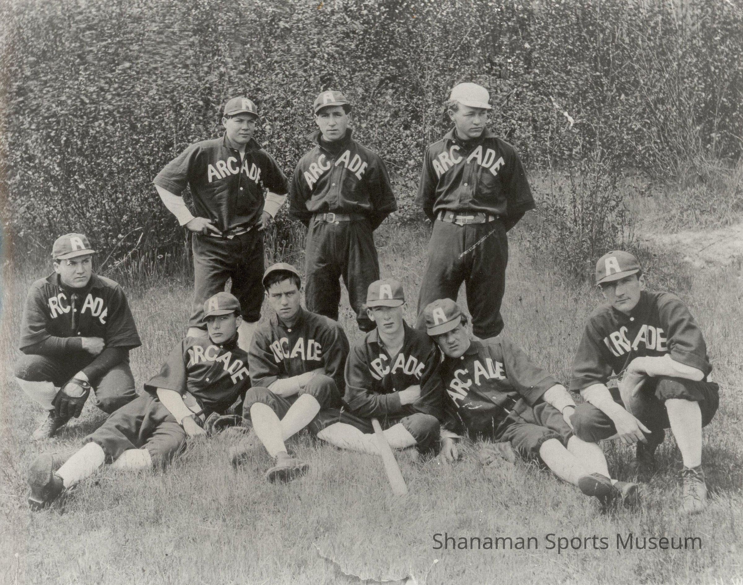Nine players of the Arcade baseball team pose in an undated photograph. Identified players are (from left), back row: Clyde Warren, Frank Cozza, Walt Moffett; front row, Harvey Hauley (second from left) and Joe Metcalf (third from left).