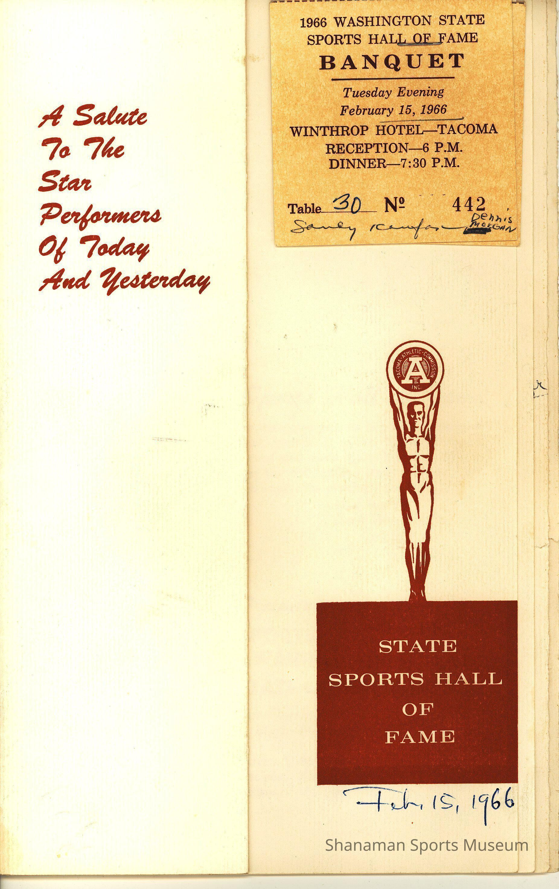 Program, 1966 WA State Sports Hall of Fame banquet, Feb 15, 1966. Two tickets are stapled to upper right corner. Signed inside by Dan Walton, Clay Huntington, Ken Still, and Mel Slattemeyer (?)