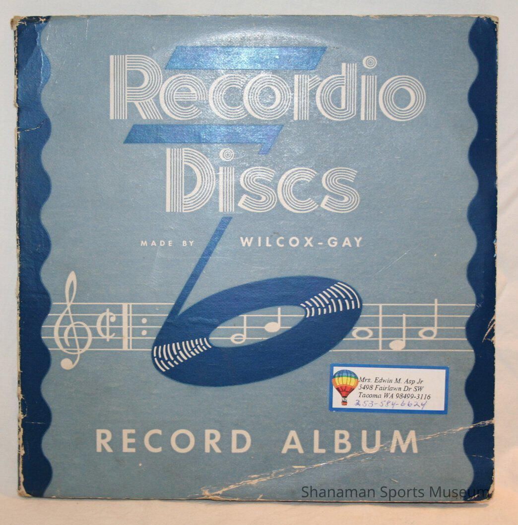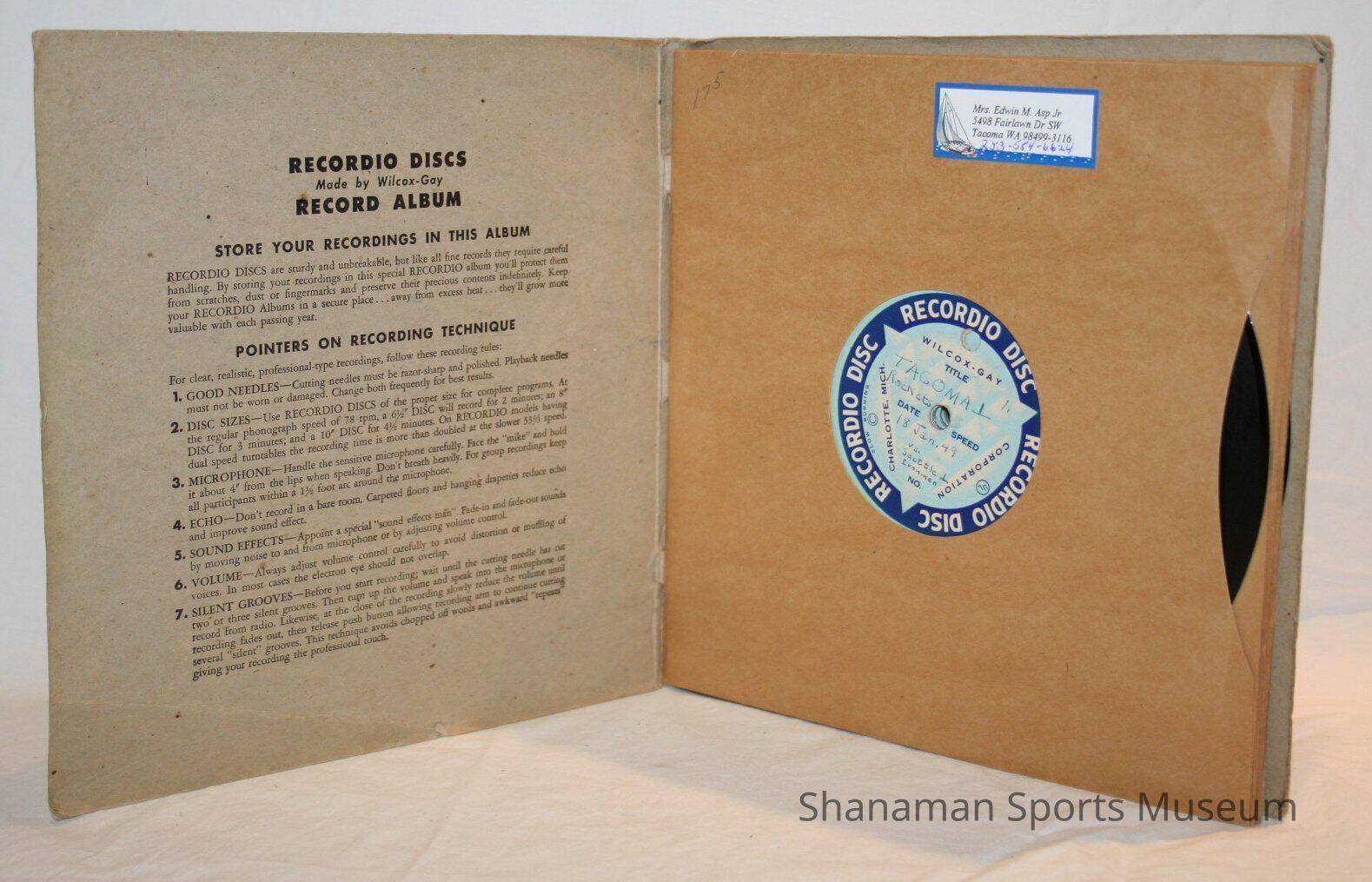Set of 6 home-made phonograph records (a-f), with written inscription on first one: "Tacoma Rockets vs. Seattle Ironmen, 18 Jan. 49". Stored in cardboard album (g), light blue, dark blue & white in color. Recordio Discs made by Wilcox-Gay CorportationLexicon