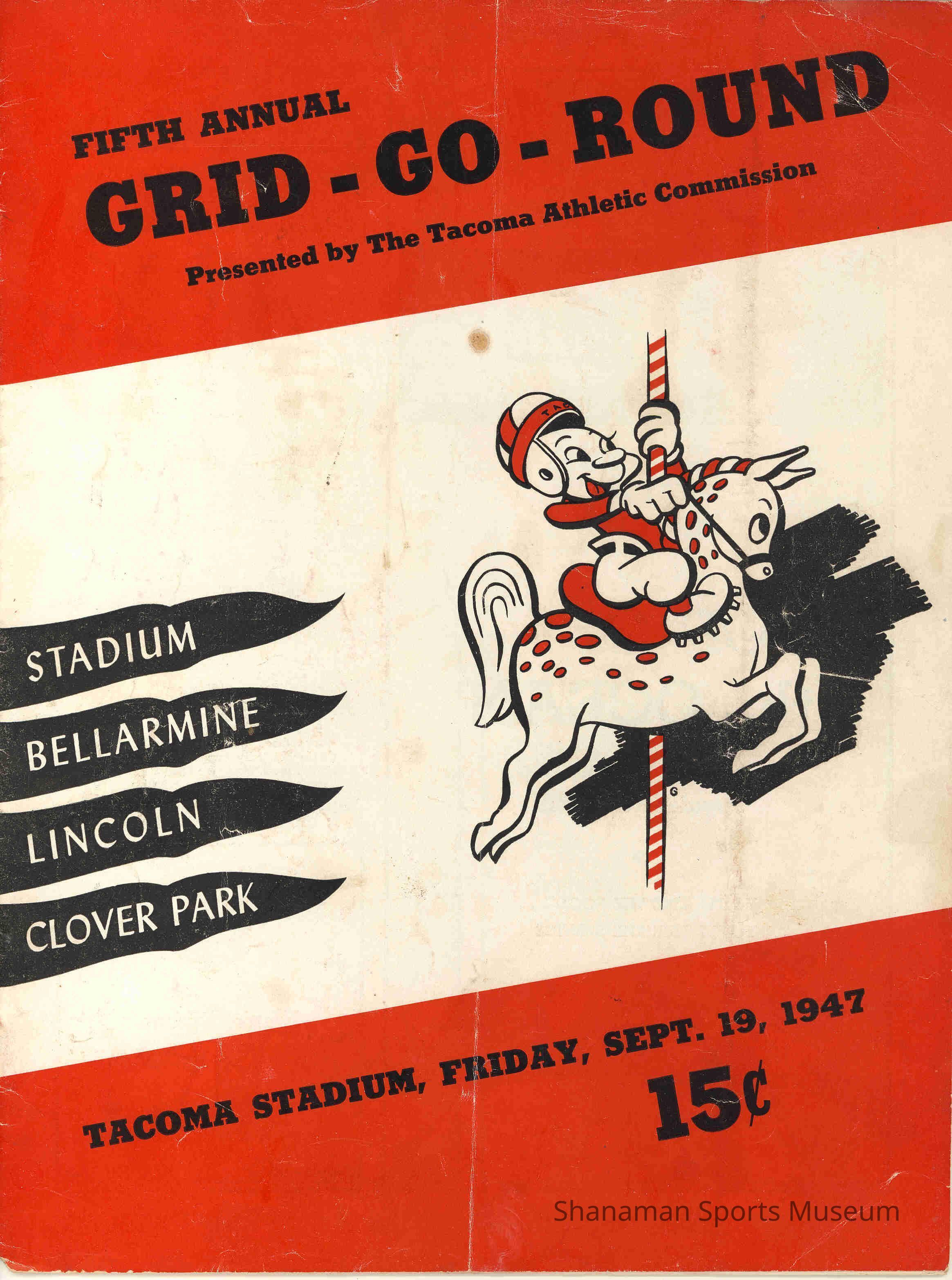 Program, Fifth Annual Grid-Go-Round, Presented by The Tacoma Athletic Commission, Tacoma Stadium, Friday, Sept. 19, 1947. Stadium, Bellarmine, Lincoln, Clover Park. Red & black cover with cartoon of a football player on a carrousel horse.Lexicon