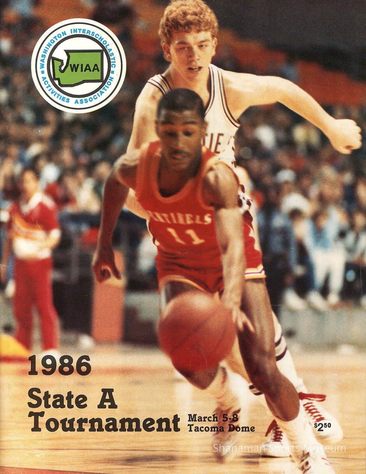 Program, 1986 State A Tournament, March 5-8, Tacoma Dome. Double cover - girls in one half of program, boys in the other (basketball)Lexicon