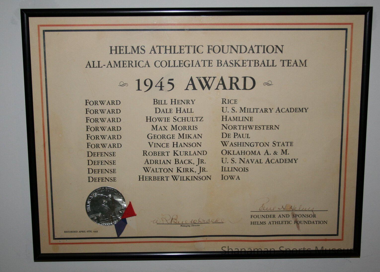 Framed award, Helms Athletic Foundation All-America Collegiate Basketball Team 1945 Award. Team includes Vince Hanson, Forward, Washington State.Lexicon