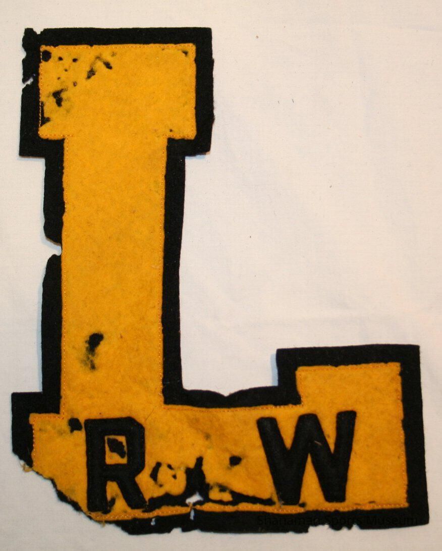 Patch, letter "L" with small letters "R" and "W" at bottom. Wool felt, yellow-orange on black. Awarded to Howard Olson for participation in Second Team Wrestling in 1930 at Lincoln High School. Originally paperclipped to 2002.25.6.Lexicon