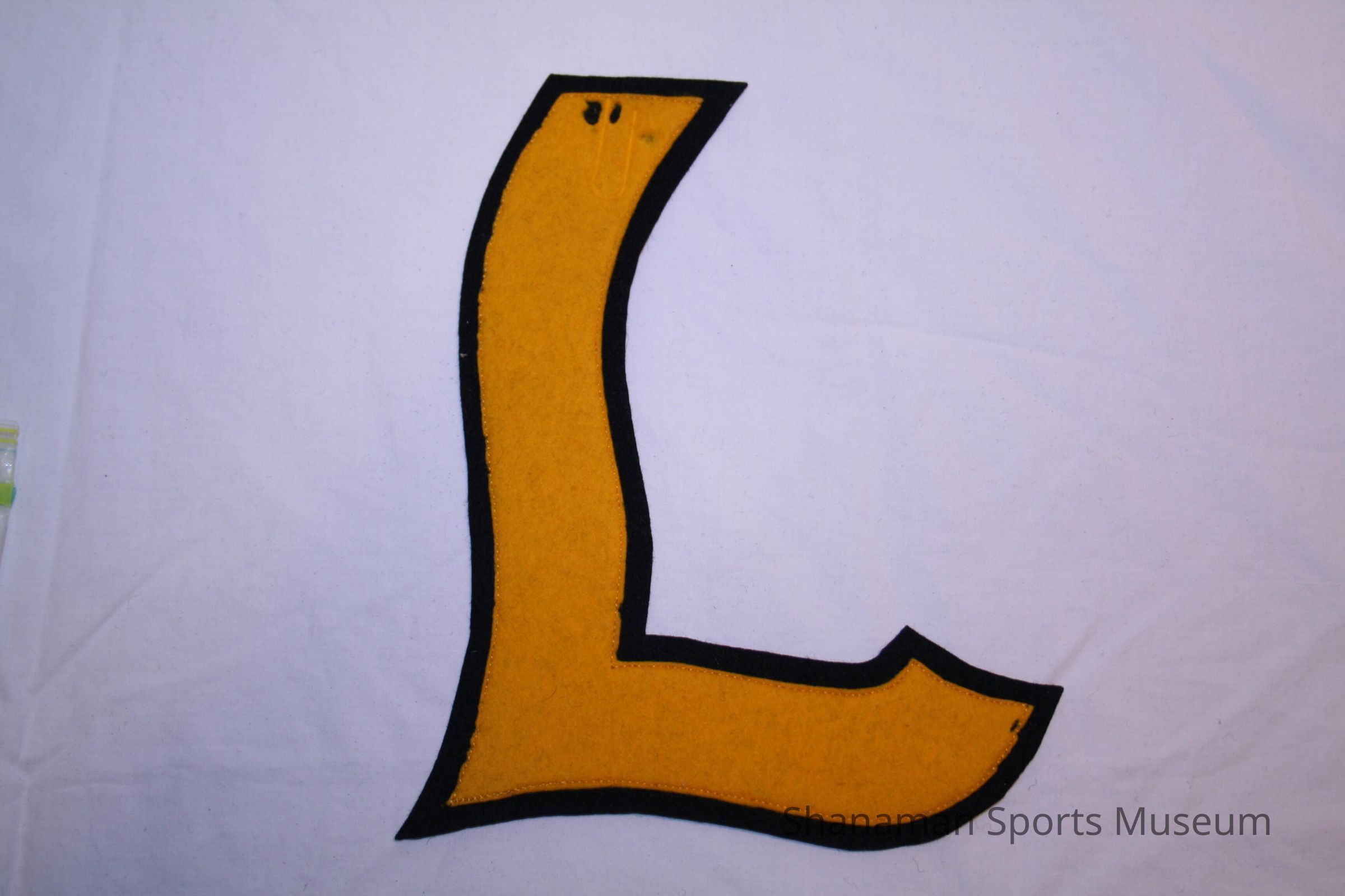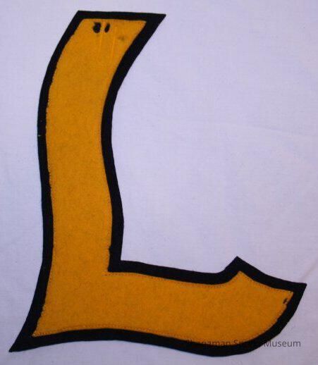 Patch, letter "L" with curved sides. Wool felt, yellow-orange on black. Awarded to Howard Olson for participation in First Team Swimming in 1931 at Lincoln High School. Originally paperclipped to 2002.25.8.Lexicon