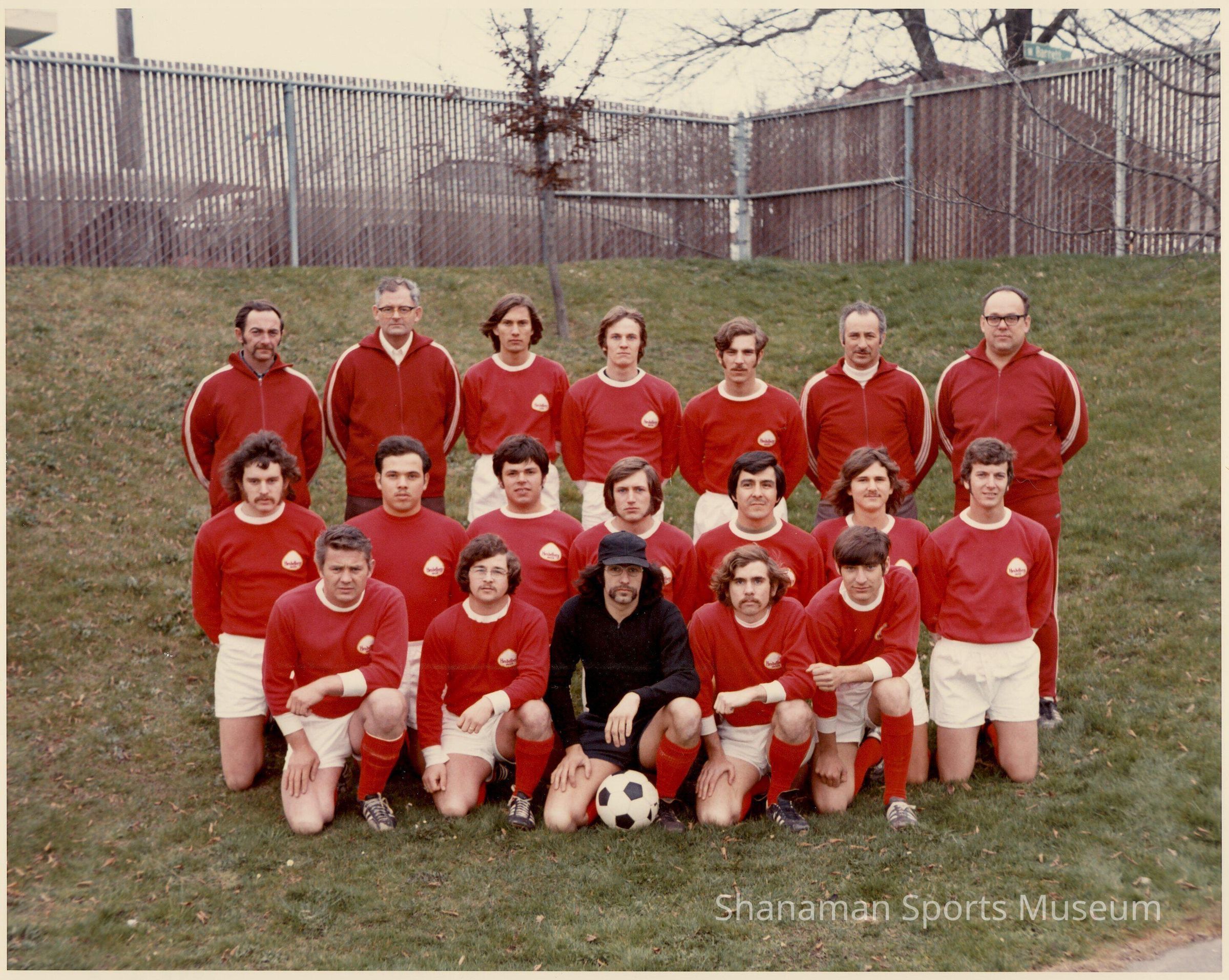 Team photo, 1972-73 Heidelberg-Tacoma Soccer Club, on field in uniforms. 15 players, all in red long-sleeve Heidelberg shirts, except goalie (center front, kneeling) in black. 4 coaches in red warm-up suits, standing back row at either end. Originally inLexicon