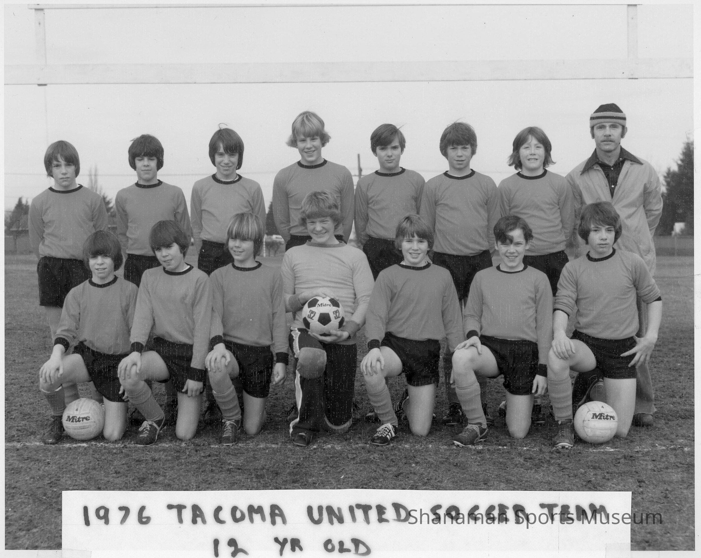 Fourteen players and a coach (standing, right) of the 1976 Tacoma United 12-year-old boys soccer team pose for a team photograph.