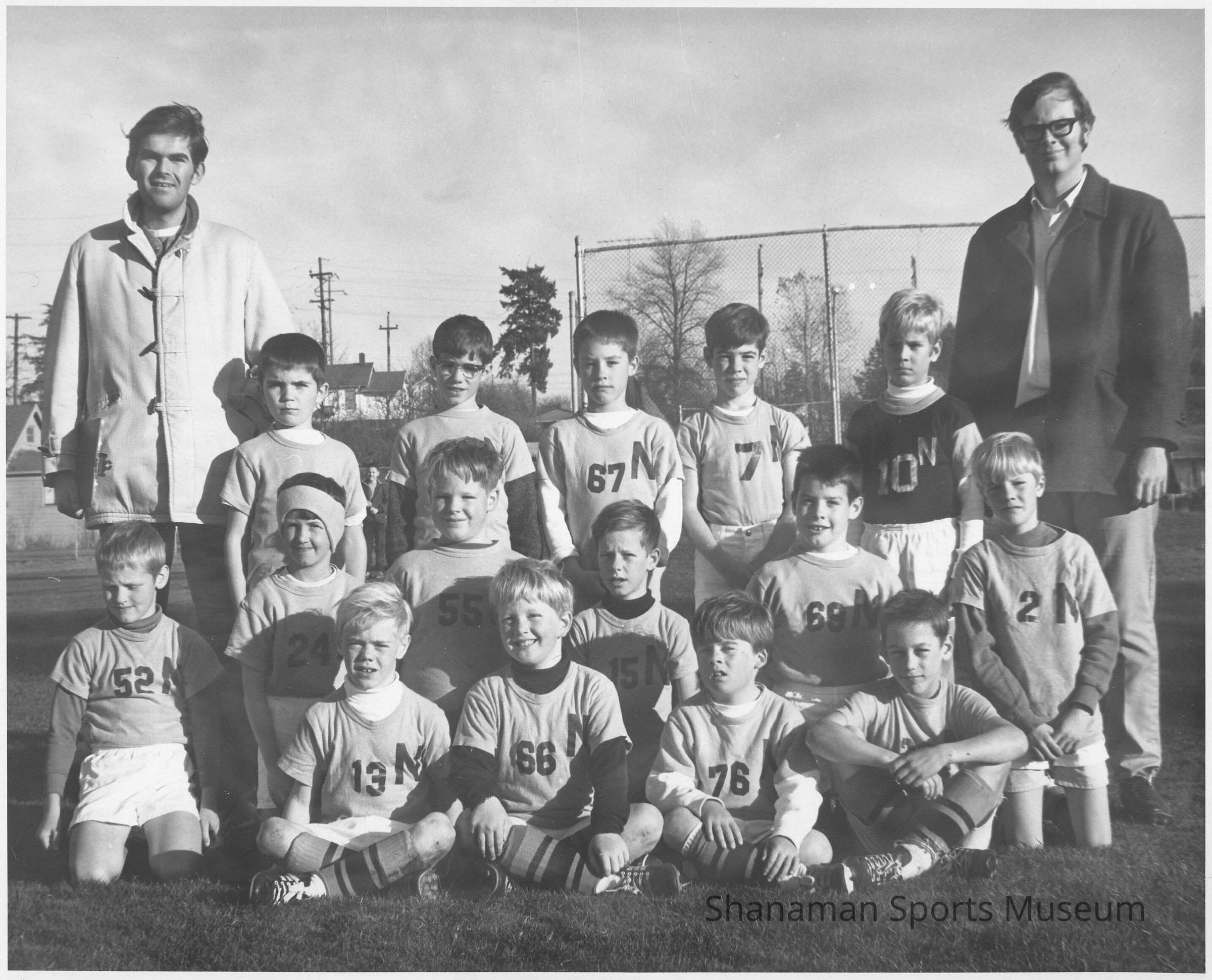 Team photo, 1969 Narrows Tigers (youth soccer). 15 boys in uniform, with 2 coaches standing at rear left and right. Originally in mat/folder with typed labels: "METROPOLITAN PARK DISTRICT CUB SOCCER CHAMPIONS" and "NARROWS TIGERS 1969".Lexicon
