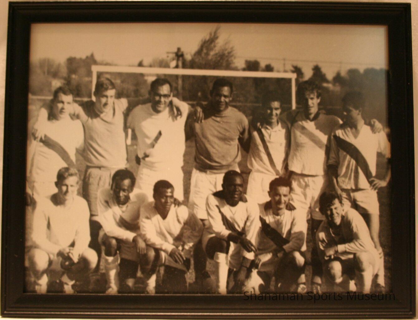 Thirteen members of the University of Washington graduate men's soccer team pose for a team photograph in 1966.Lexicon