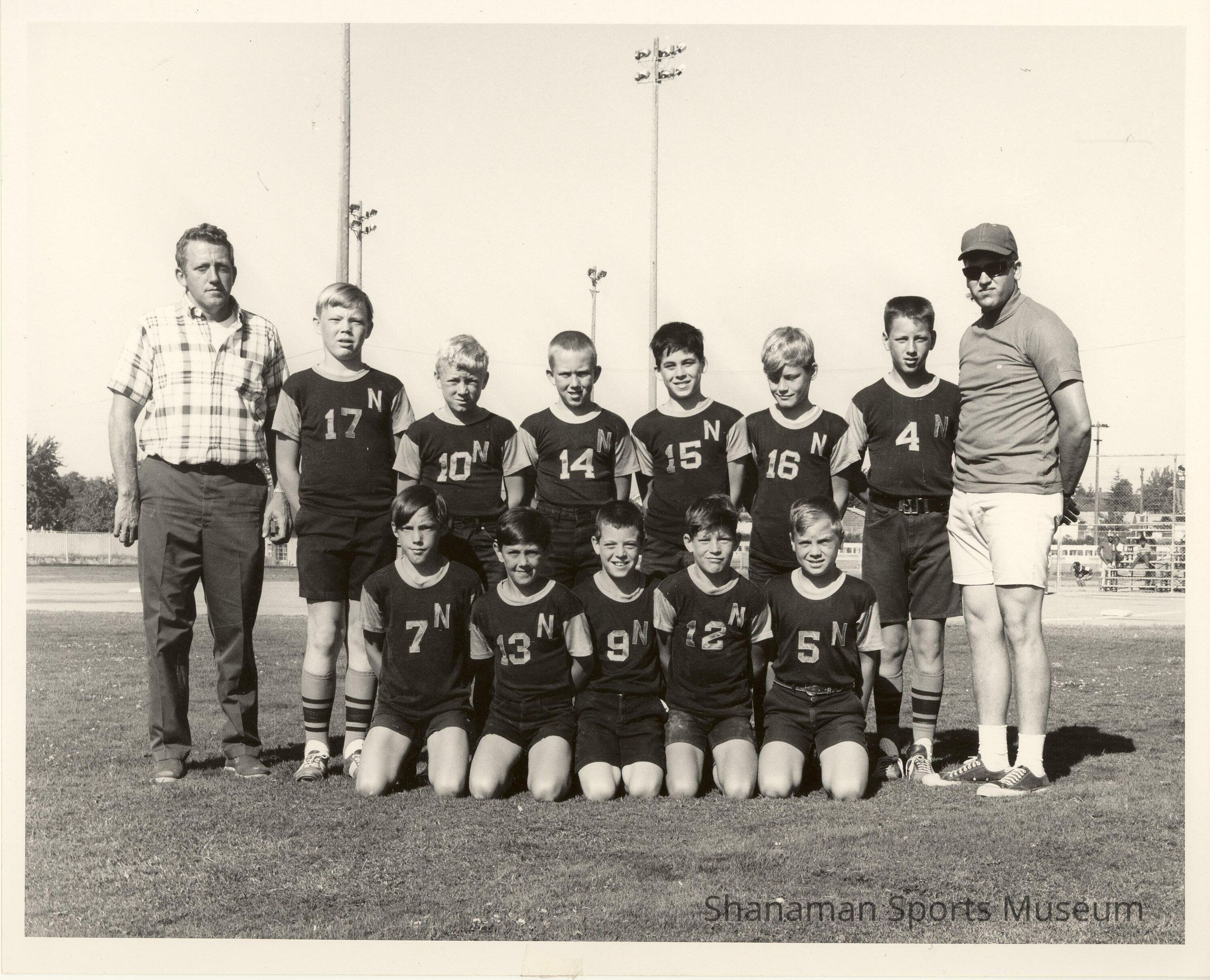 Eleven players and two adult coaches of the 1969 Narrows Roadrunners pose for a team photograph.