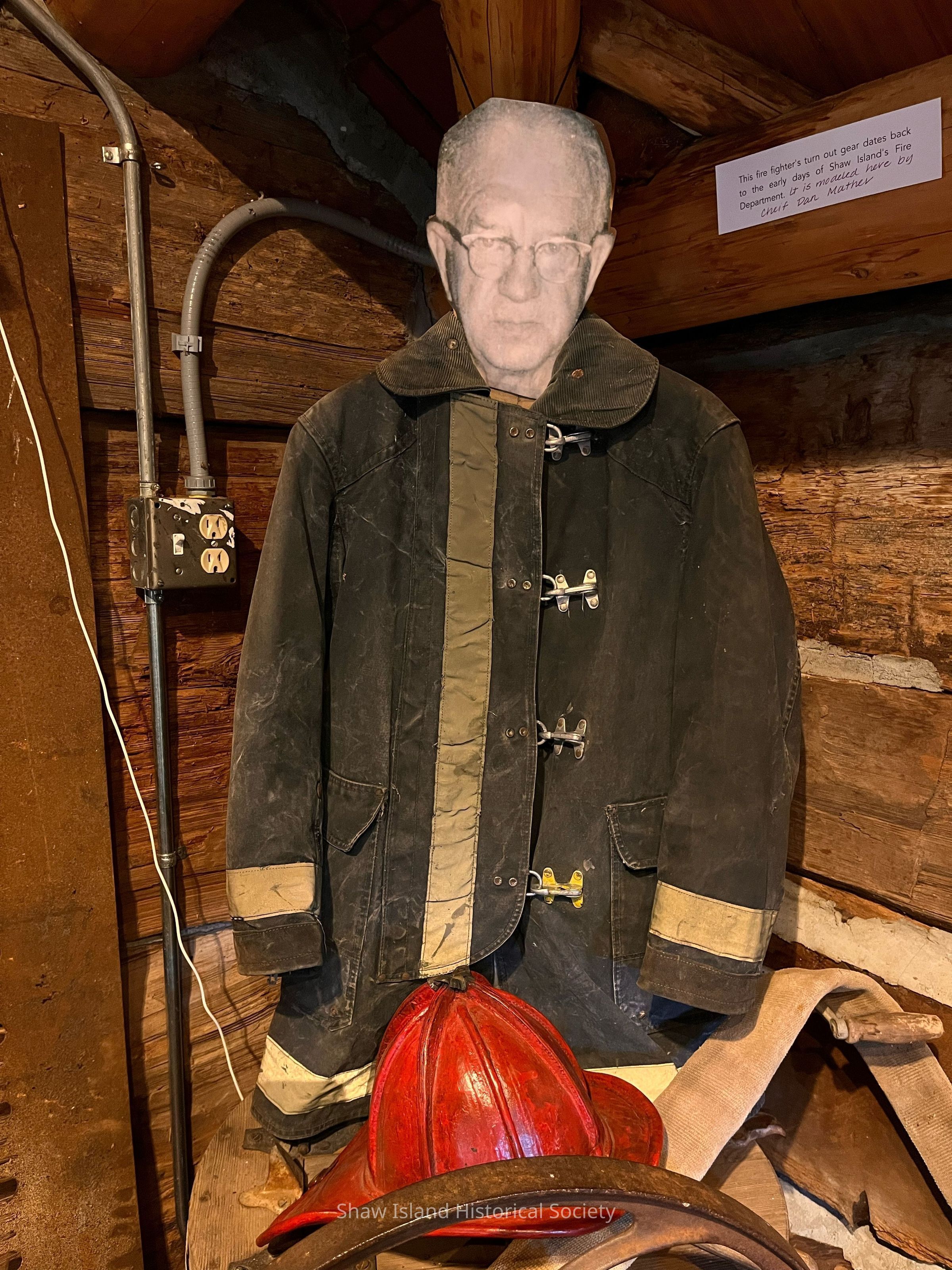 This fire fighter's turn out gear dates back to the early days of Shaw Island's Fire Department. It is modeled here by Chief Dan Mather