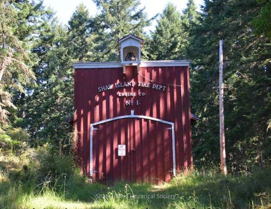 The Shaw Island Fire Department Engine Company No. 1 still stands on its little rise up from the intersection of Neck Point Road and Ben Nevis Loop, on land donated by Ed and Ethel Willis in 1963. (Photograph by Wally Howland, dated 1970.)