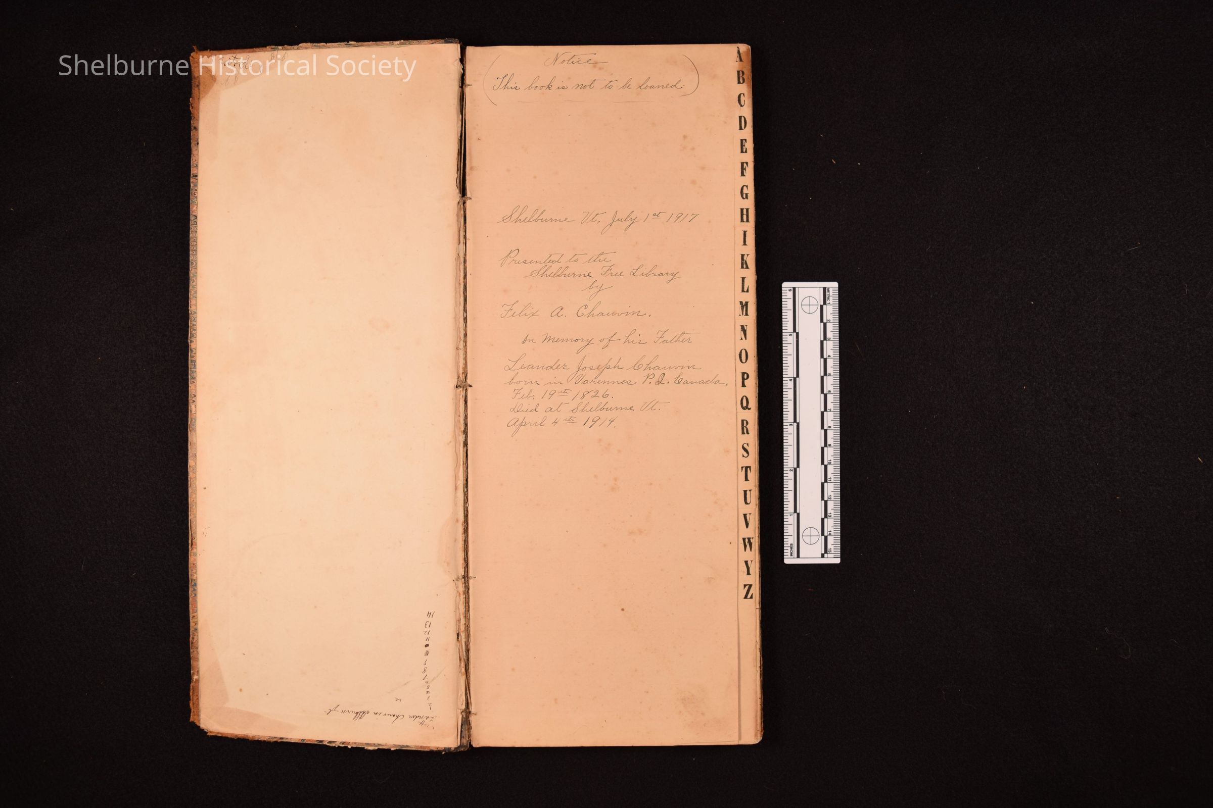 An accounting ledger used by Leander Joseph Chauvin 1850 - 1854. Entries in the ledger would suggest he was the town cobbler. Transactions include cash and barter payments.