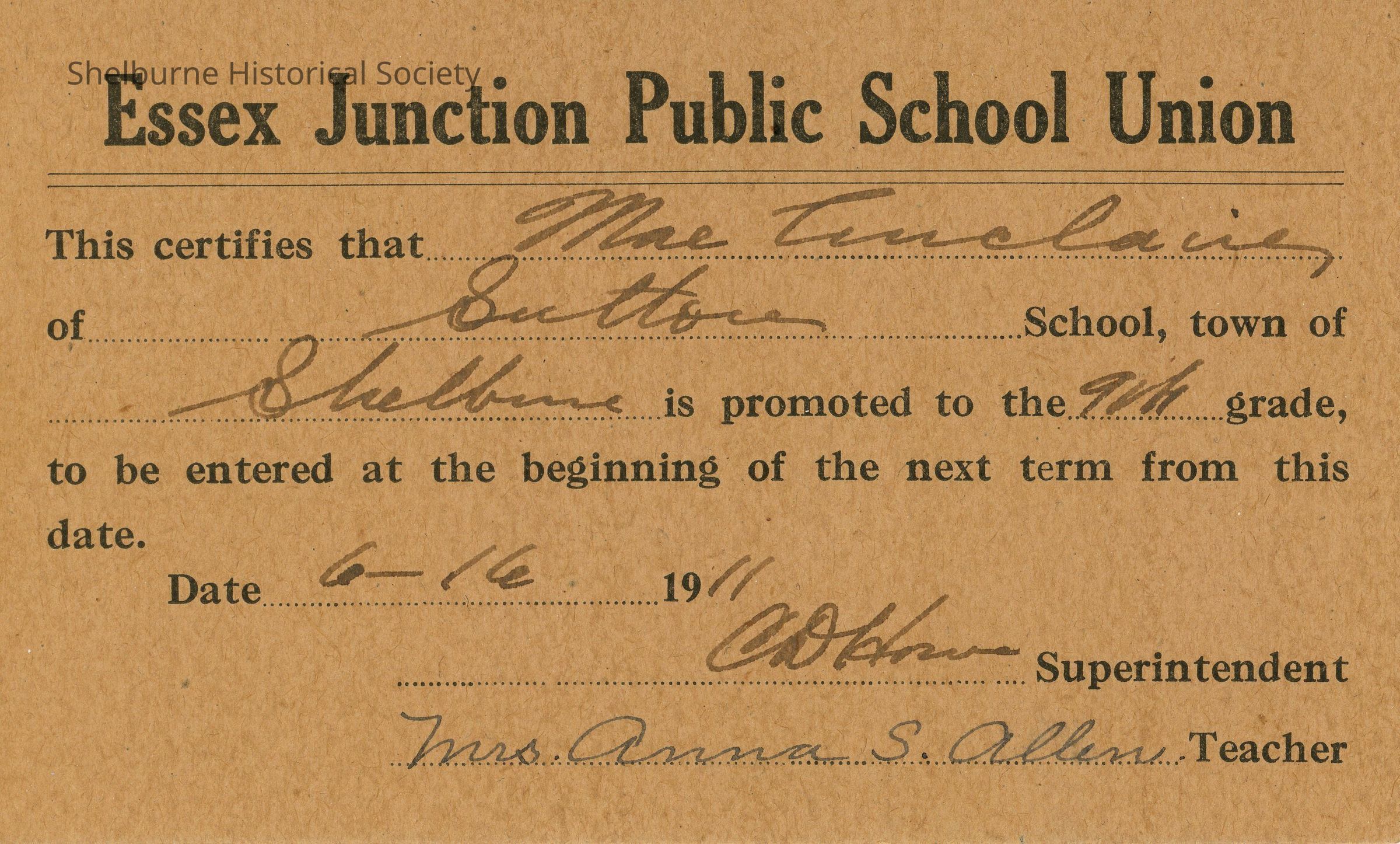 "This card certifies the Mae Auclaire of Sutton School, town of Shelburne is promoted to the 9th grade...."