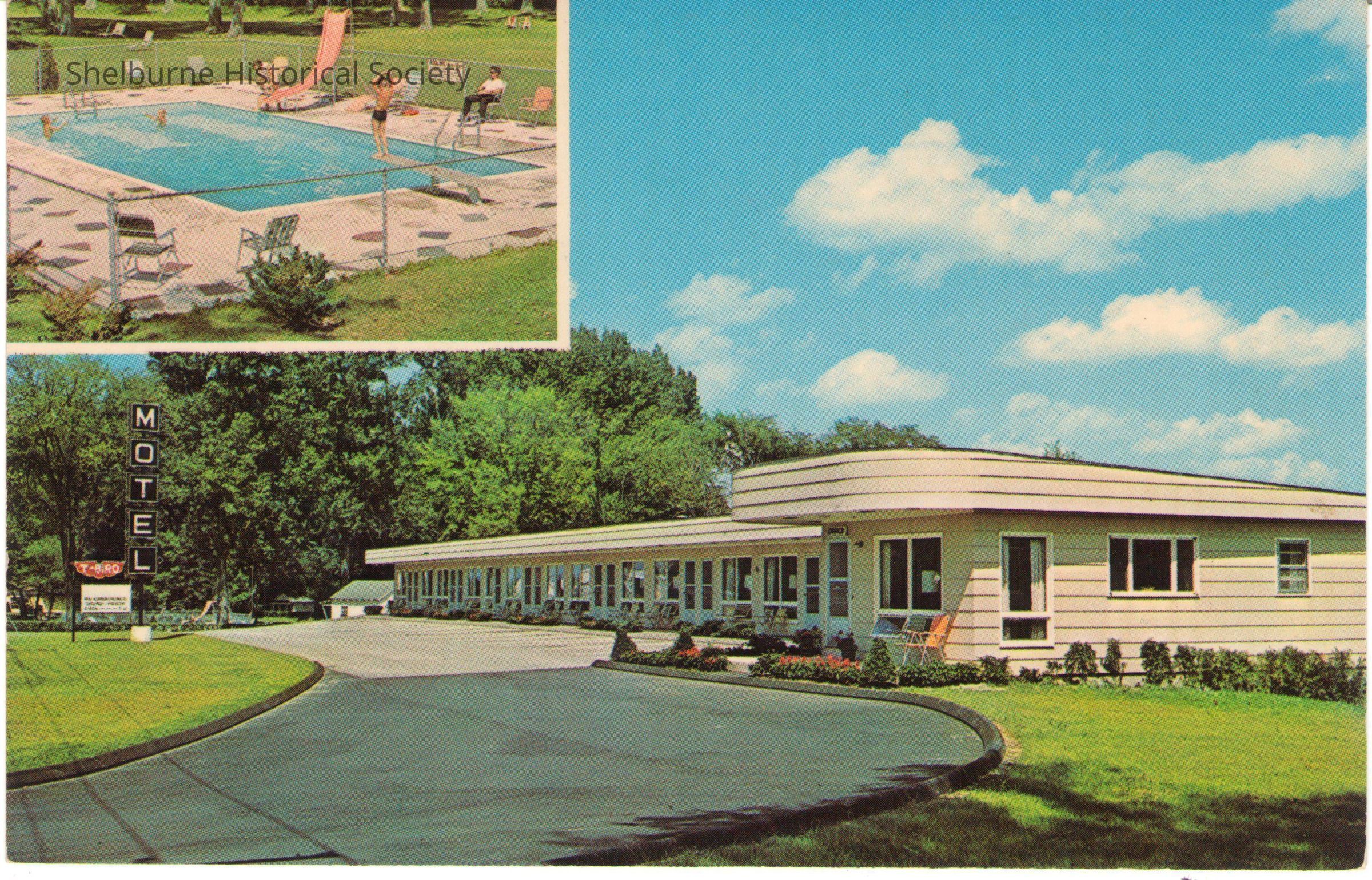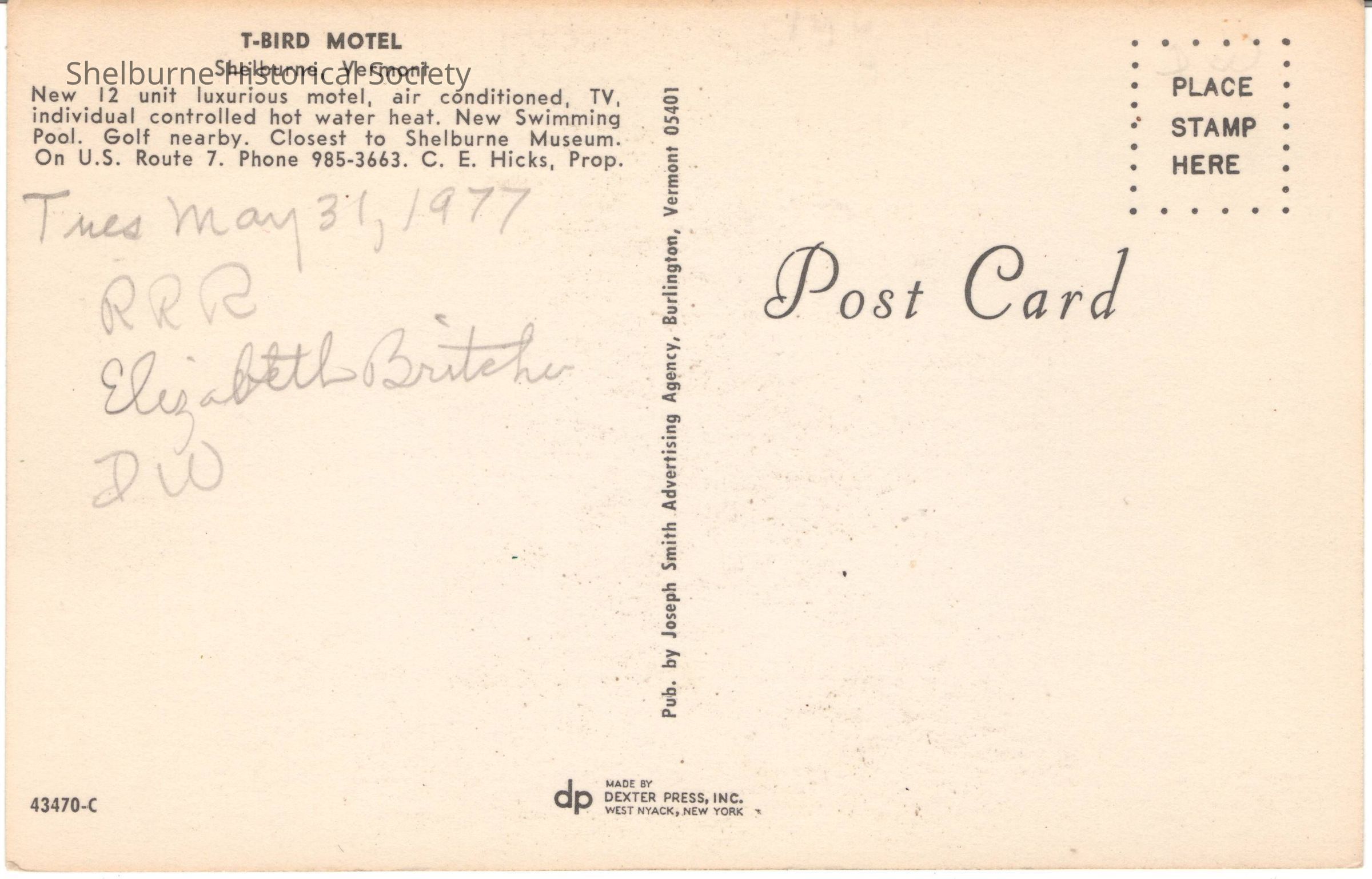 Printed on the back of the postcard: "T-BIRD MOTEL, Shelburne, Vermont. New 12 unit luxurious motel, air conditioned, TV, individual controlled hot water heat. New Swimming Pool. Golf nearby. Closest to Shelburne Museum. On U.S. Rout 7. Phone 985-3663. C.E. Hicks, Prop."Lexicon
