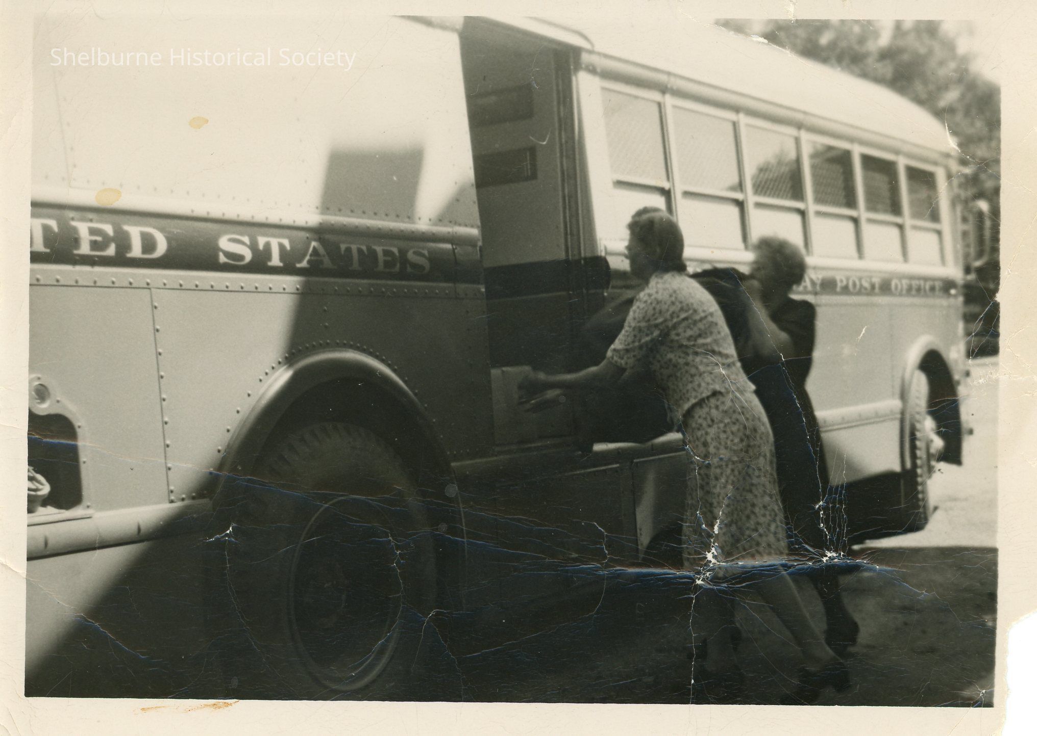 U.S. Post Office Bus being unloaded by two women, circa 1950's, presumably located in Shelburne, Vermont and used to distribute U.S. Mail between Post Office locations.Lexicon