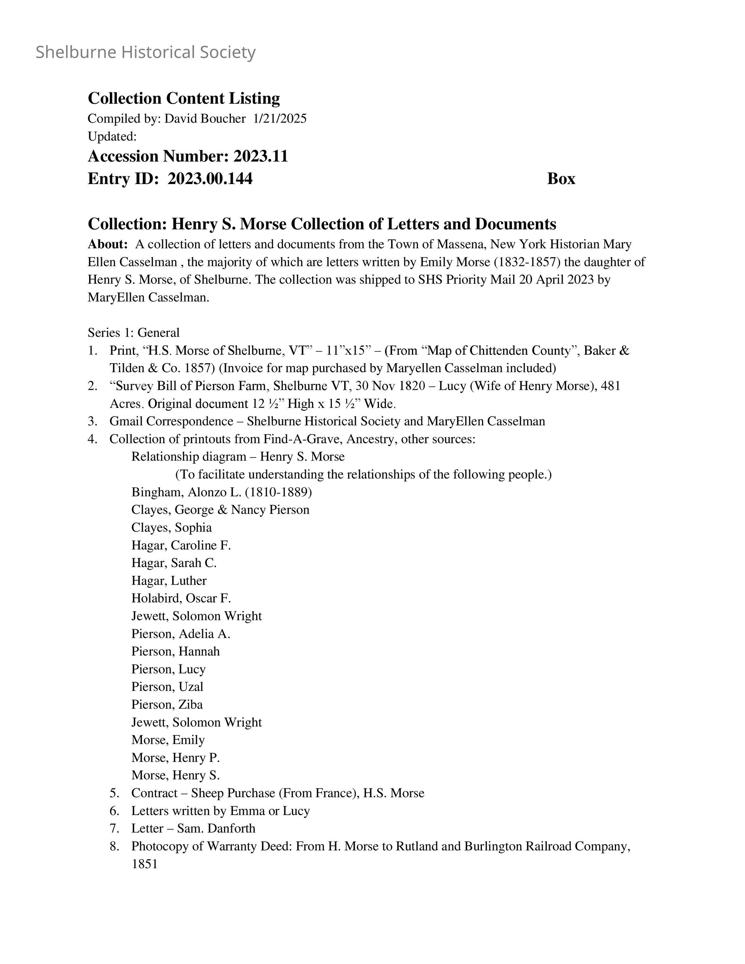 Morse, Henry S. (1800-1875), Morse, Emily (1832-1857), Jewett, Solomon Wright, Holabird, Holabird, Oscar F., Pierson, Lucy (1799-1866), Pierson, Ziba (1761-1820), Hagar, Luther, Pierson, Clarissa (1804-1881), Pierson, Nancy (1797-1866), Clayes, George