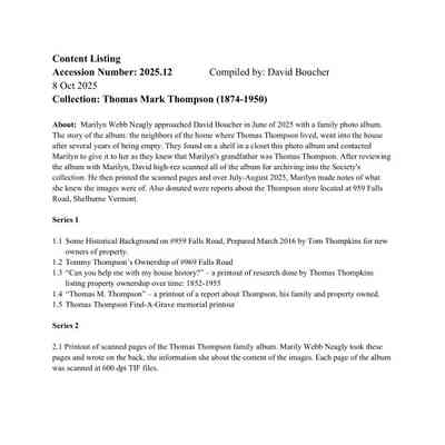 This collection contains scanned images of a family photo album, historical background about property owned by Thomas Thompson, of note a retail store located on Falls Road, Shelburne, Vermont, and family historical and genealogical information.Lexicon