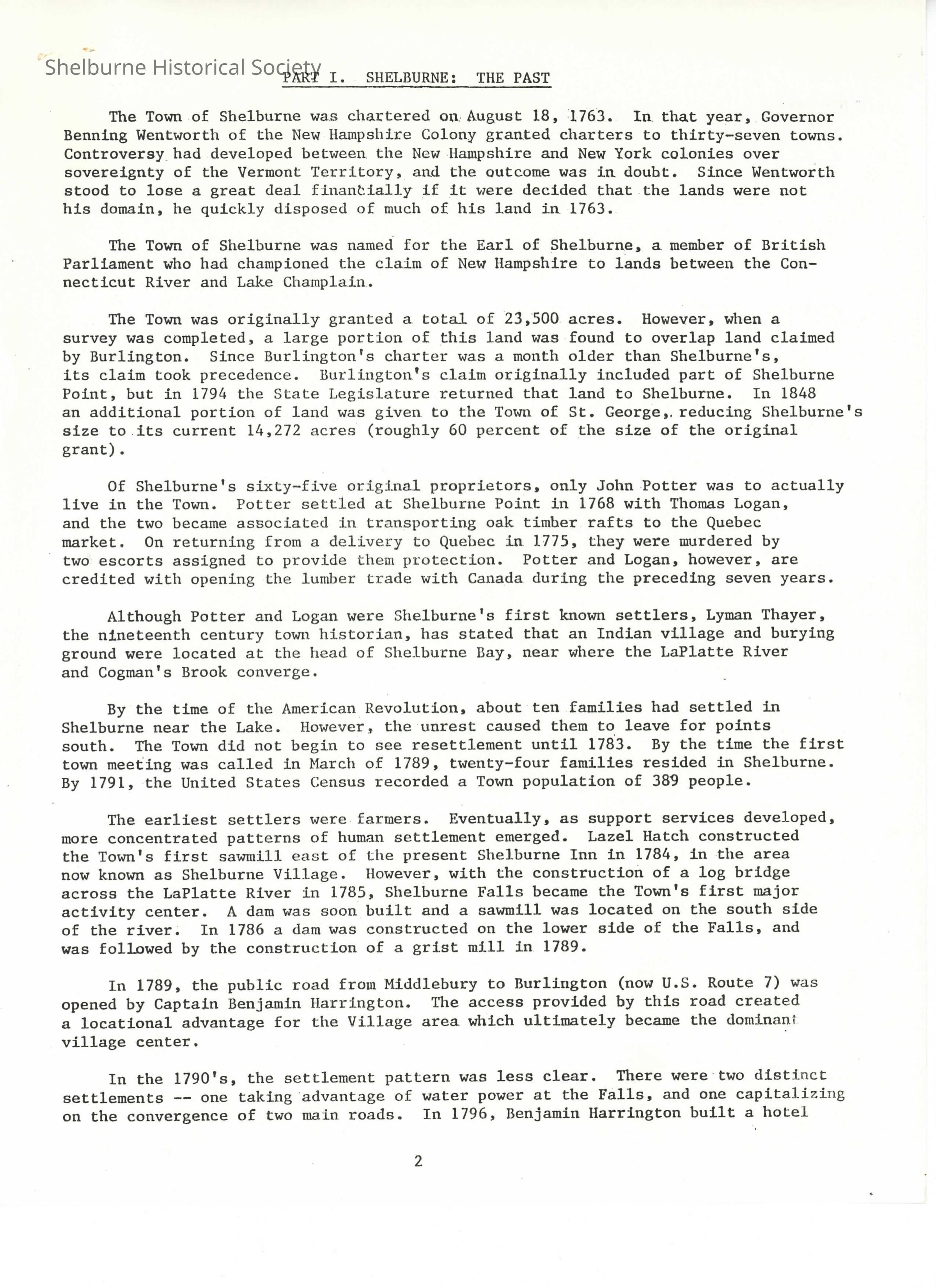 Two articles, Shelburne: The Past was written (3 pages) as part of a Town Plan report in the 1980's and History of the Town of Shelburne, a typewritten article (two pages) about 1970's. Both summaries of Shelburne's history. Authors unknown and date of creating presumed from content.Context