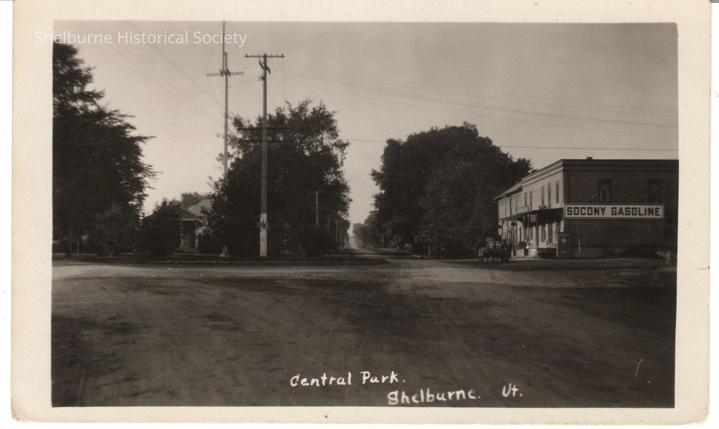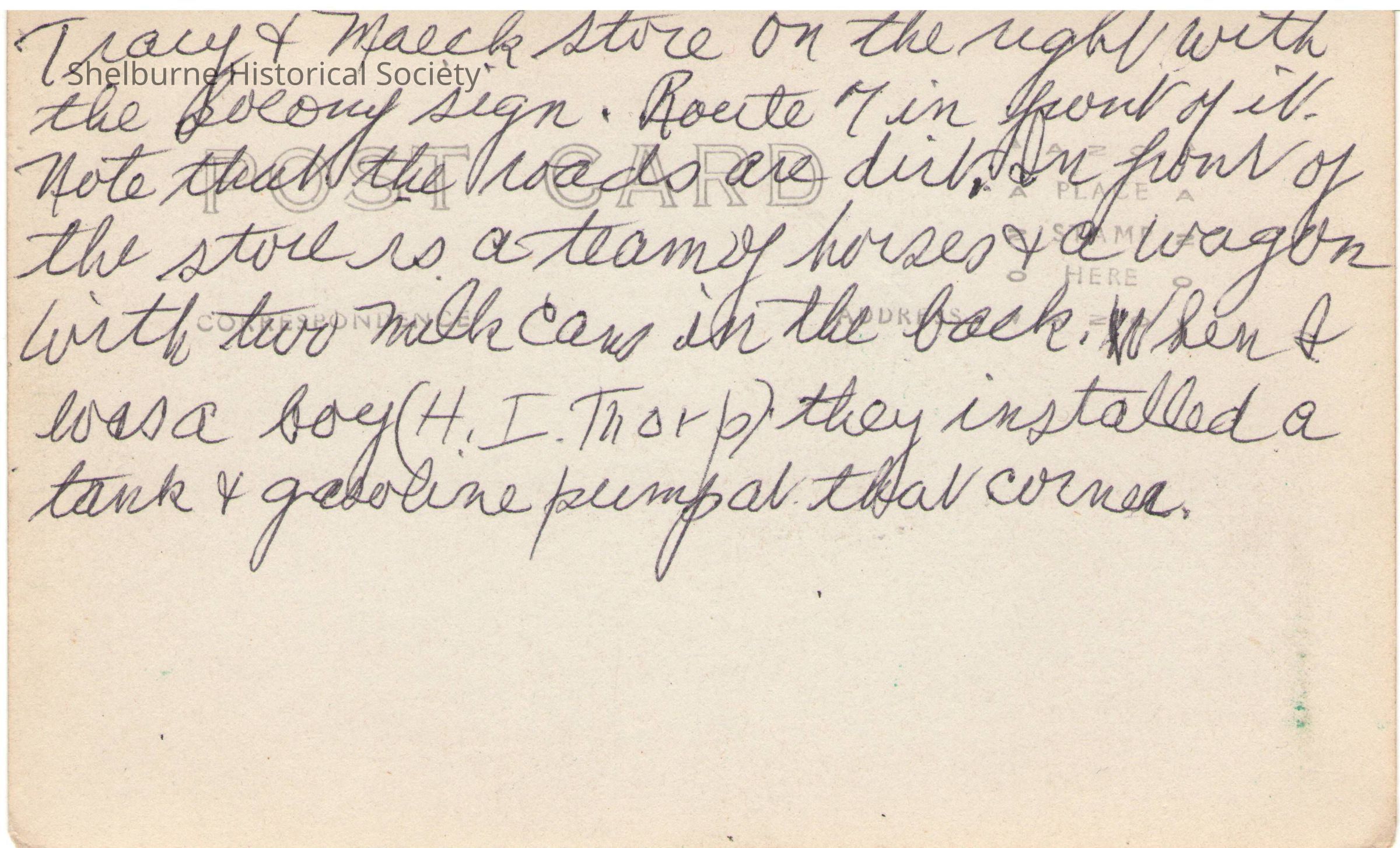 From the back of the postcard: "Tracy & Maeck store on the right with the Socony sign. Route 7 front of it. Note that the roads are dirt. In front of the store is a team of horses & a wagon with two milk cans in the back. When I was a boy (H.I. Thorp) they installed a tank & gasoline pump at that corner."Lexicon