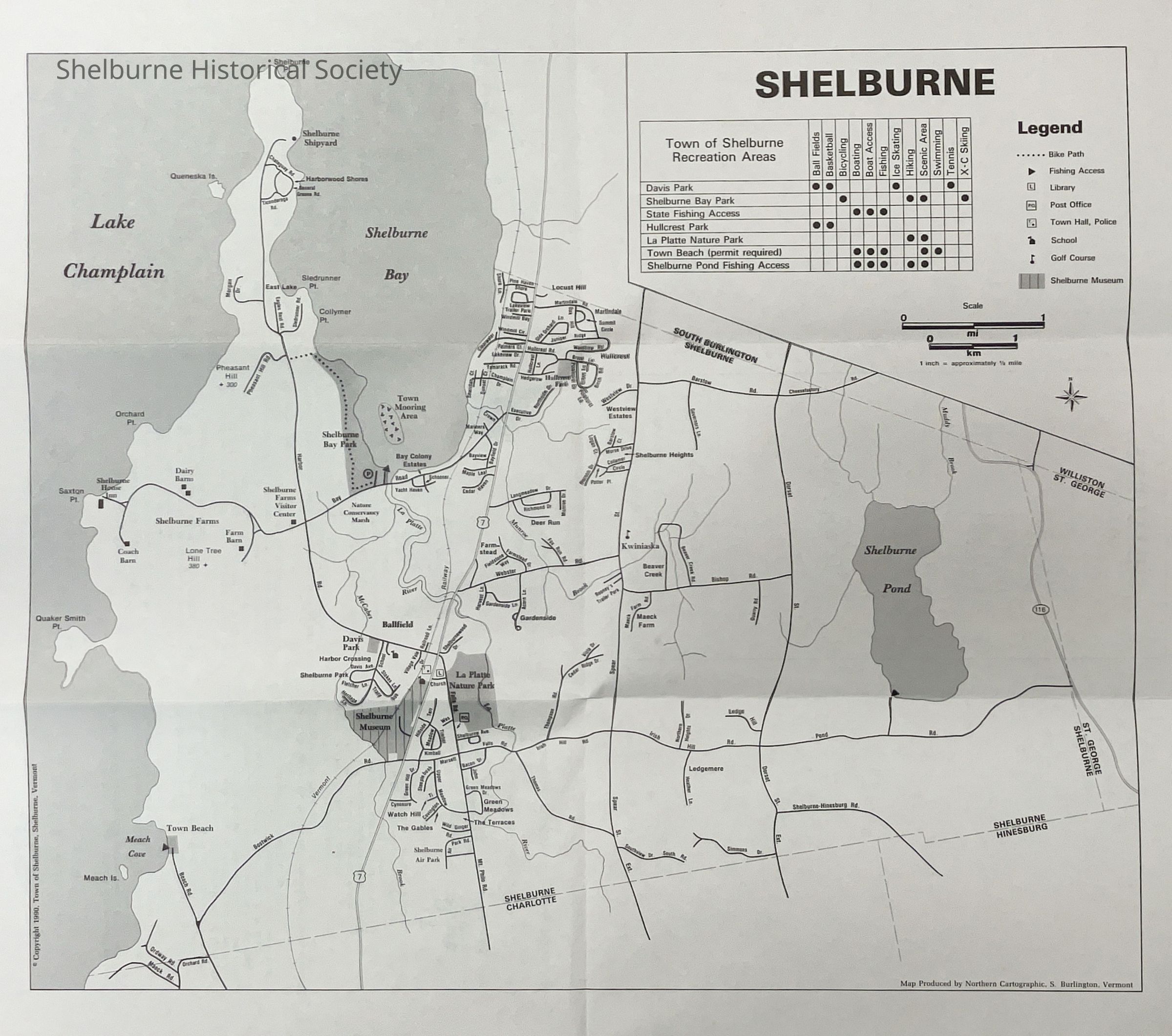 A general use map created by the Town of Shelburne, Vermont with general geographic information, town offices with phone numbers, Shelburne Farms and Shelburne Museum advertising, roads with names, recreational areas.Lexicon