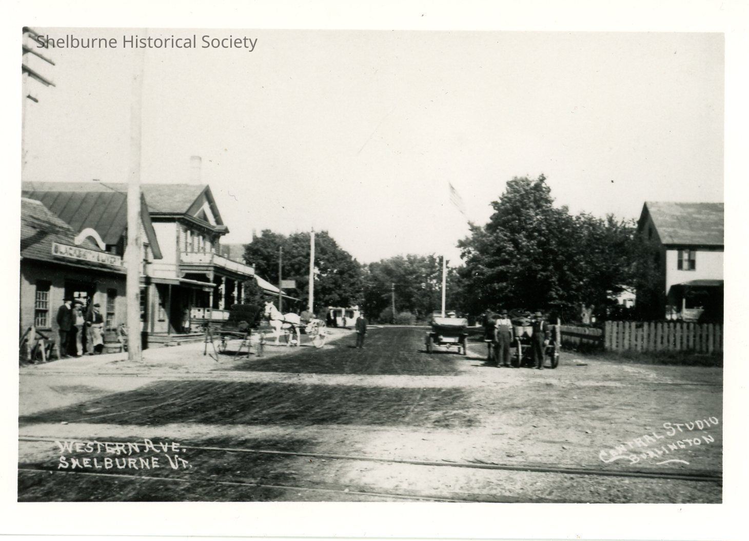 Street view of Western Avenue facing East, Shelburne, Vermont. Note the railroad tracks in the foreground.Subject Person or Organization