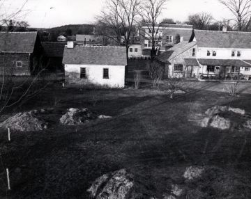 This image is taken facing North, with the two story Shelburne High School in the background. The building in the right foreground, as of July 2023, is part of the Shelburne Museum - the Variety Unit which houses decorative arts, glassware, pewter, ceramics, and dolls. In the foreground appears to be raked grass clippings. The Shelburne Historical Society has a digital image provided by the Shelburne Museum who has the original print.Photograph Details