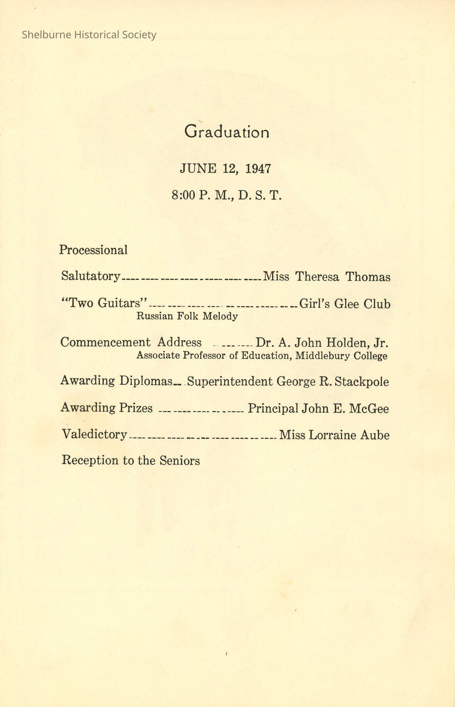 Shelburne High School Graduation Program 1947Entry/Object ID