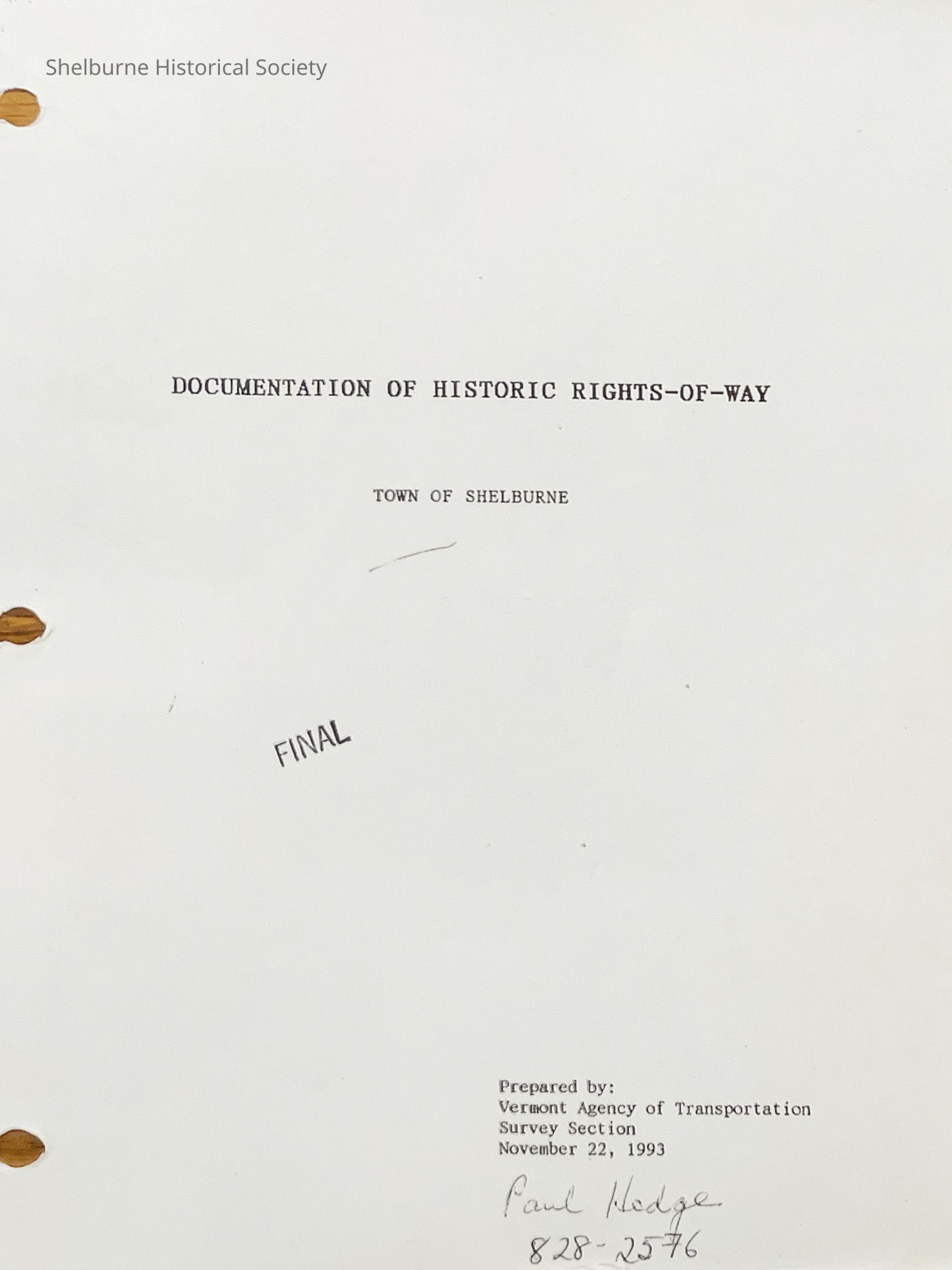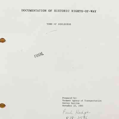 Shelburne completed this project and is recorded and details available in the Town Records Vault. The State of Vermont provided "Documentation of Historic Rights of Way" i.e. the State's records of Shelburne's Roads. Shelburne then undertook the task of finding all information they could about properties which referenced town roads. Of note is the term vendue, literally defined means 'a public sale'. If a landowner did not keep up with paying taxes, his property was sold at auction and was a way for other more wealthy landowners to increase their property wealth.