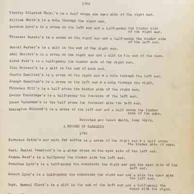 The original town records in Volume 1-5 have been preserved. The Copies of Town Meeting Records, being typewritten copies of the original record pages allows the researcher ease of use eliminating the need to interpret the original records script. In addition, there are now indexes for the records of volume 1-5 in the Copies of the Town Meeting Records.Lexicon