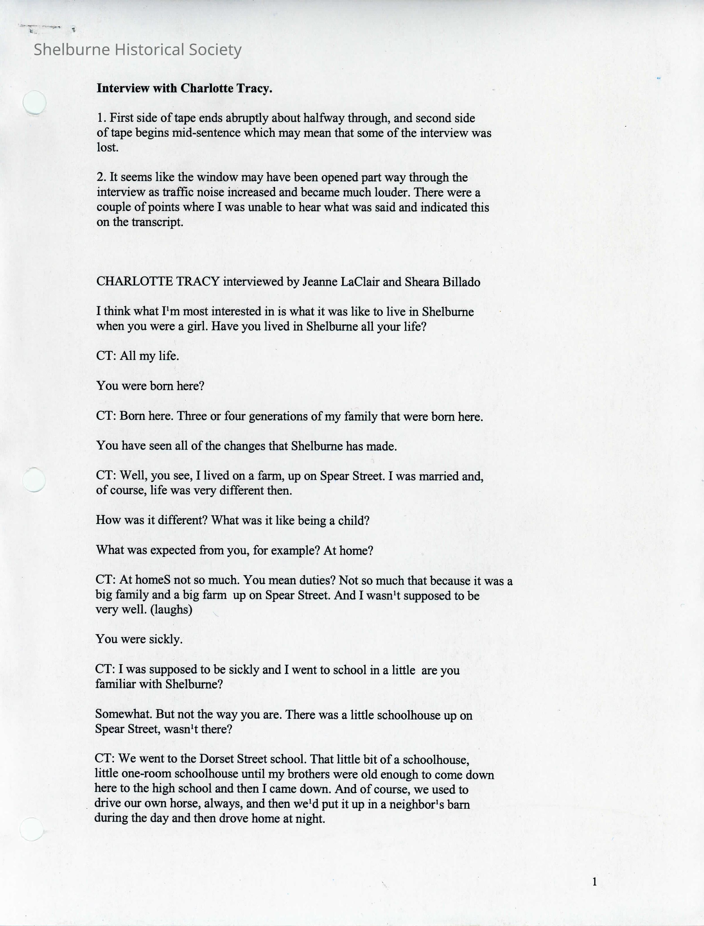 This transcript of an interview with Charlotte Maeck was discovered in the Pierson Library by David Boucher, Shelburne Historical Society Collections Manager 5 May 2025 and scanned into the Society collections. See also 2023.00.175 Transcript Oral History Hannah Tracy. The two transcripts are combined in a three ring binder with the original digital media.Context