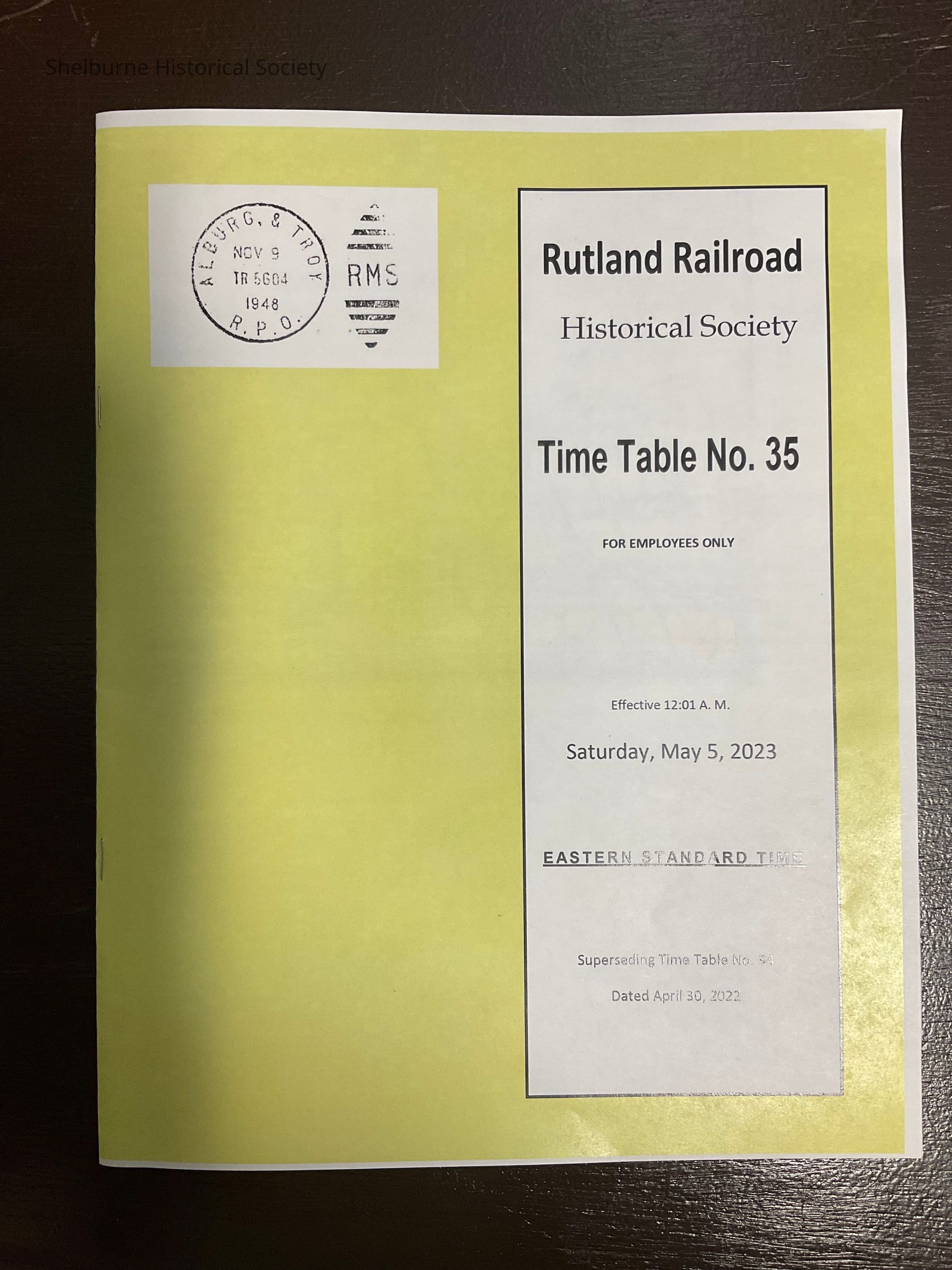 This is the Rutland Railroad Historical Society 35th Annual Convention Document that was passed out to attendees. It contains the days meeting agenda, pictures pertaining to S.W. Webb, Shelburne train station. Meeting was attended by David Boucher.