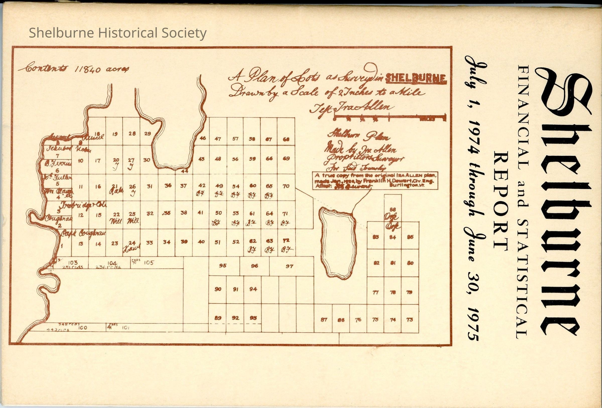From the report cover: "Shelburn Plan, Made by Ira Allen proprietors survey for said township", "A true copy from the original Ira Allen plan, made Jan 1920 by Franklin Dewart, Civ. Eng., Burlington, VT."