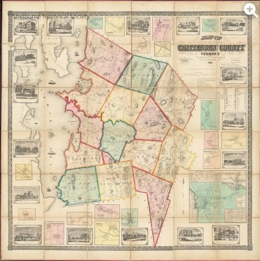 A digital file of the 'Map of Chittenden County Vermont' created by Walling, Henry Francis (1825-1888) in 1857. The map shows householders names and includes 18 city insets, table of distances, statistics and illustrations. Inset map of Burlington and Winooski include business directories. The Shelburne Historical Society has downloaded the digital file of the map from DigitalCommonwealth.org, the Primary (full resolution, uncompressed) TIF, 933 MB. The physical copy of this digital map resides in the Boston Public Library. Another mounted and framed copy is located in the Shelburne Vermont Town Clerks Office.Context