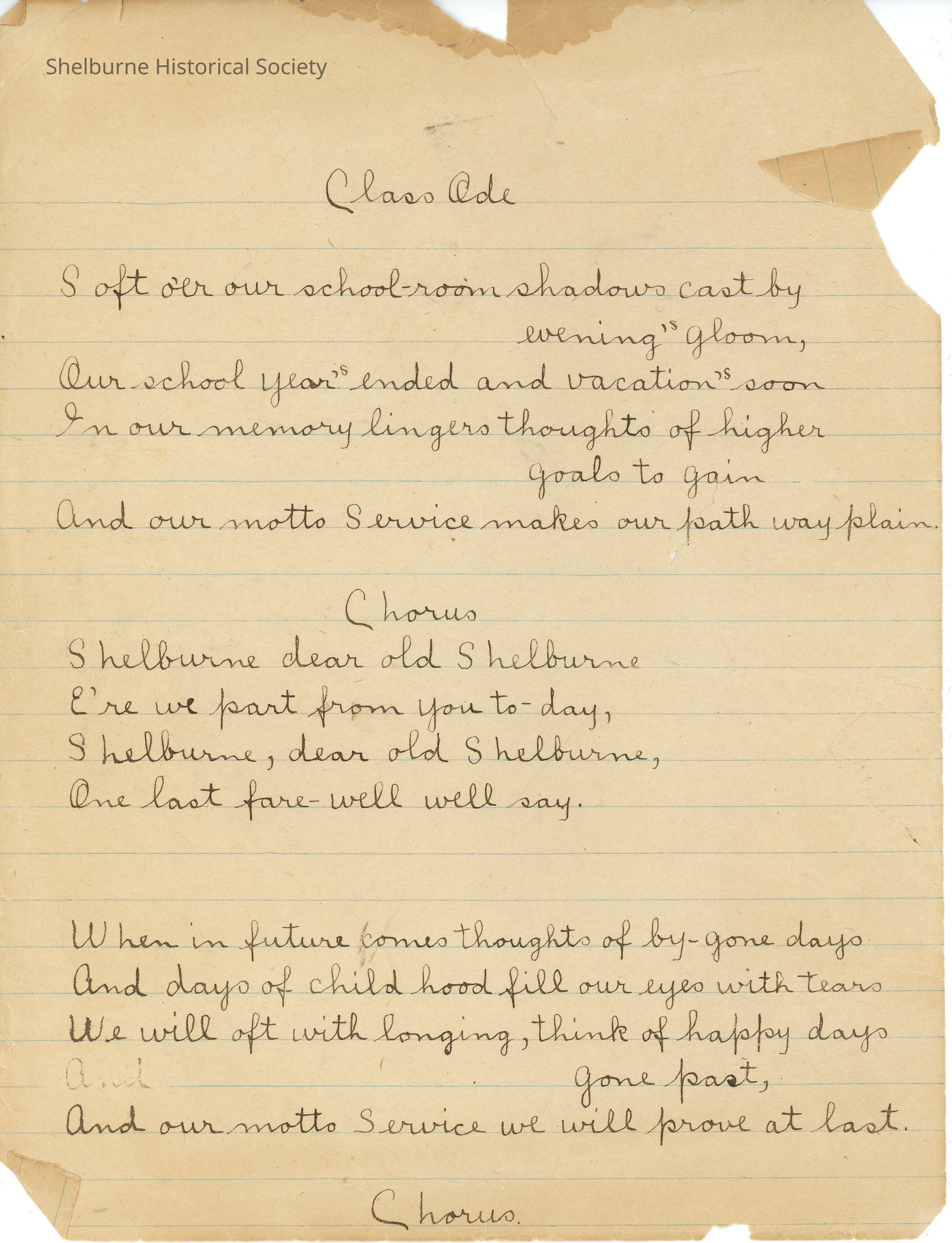 A handwritten class song, [for Shelburne High School?].Lexicon
