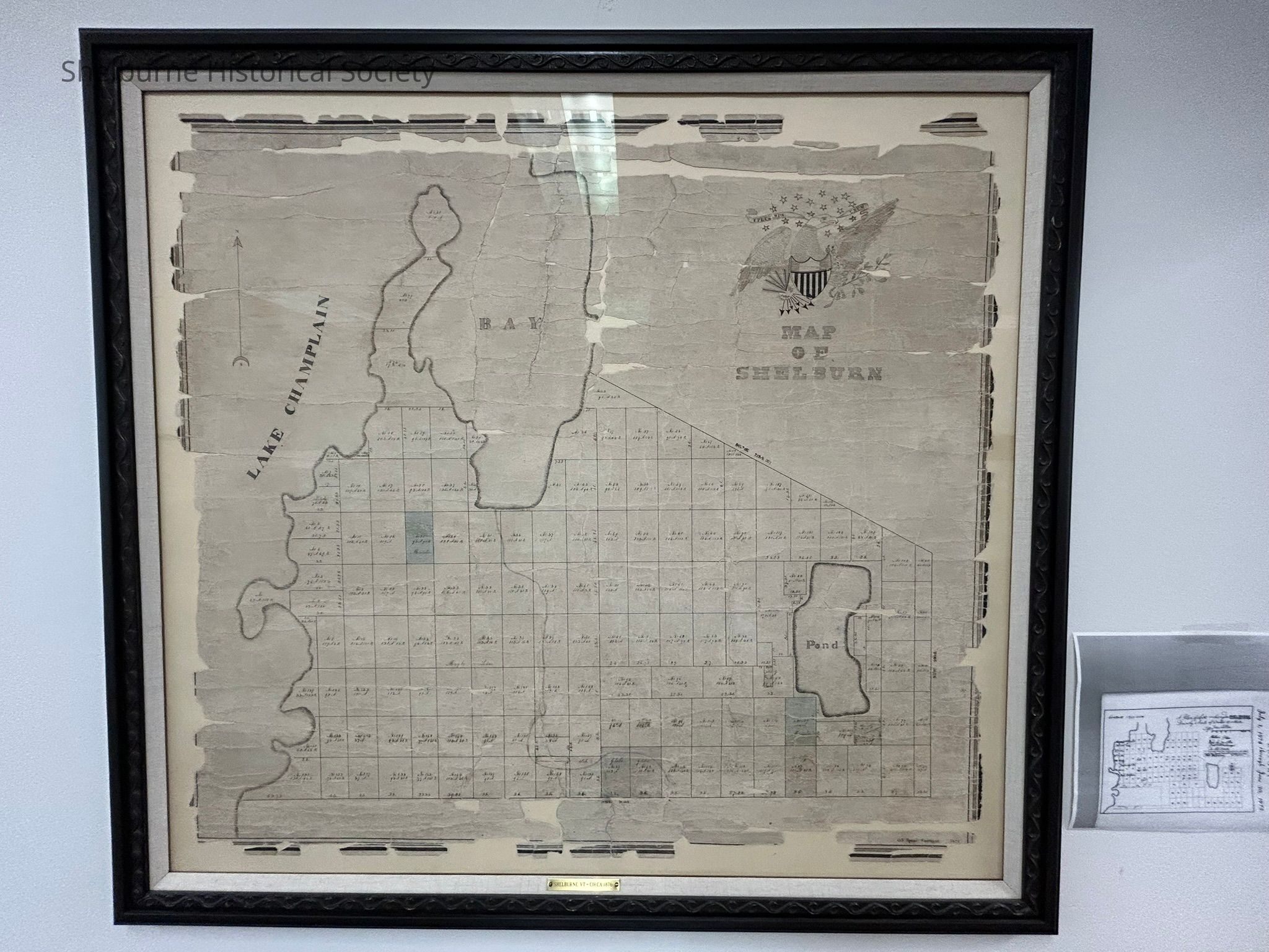 This is a primary source map for the Town of Shelburne, Vermont as it helps to make the transition of property ownership from the the original town grants to owners moving in to the town. The physical map was restored from a very poor condition by the Northeast Document Conservation Center in 1988 with funds provided by the Shelburne Historical Society. It was later framed behind glass and is on display in the Shelburne Vermont Town Clerks Office.Lexicon