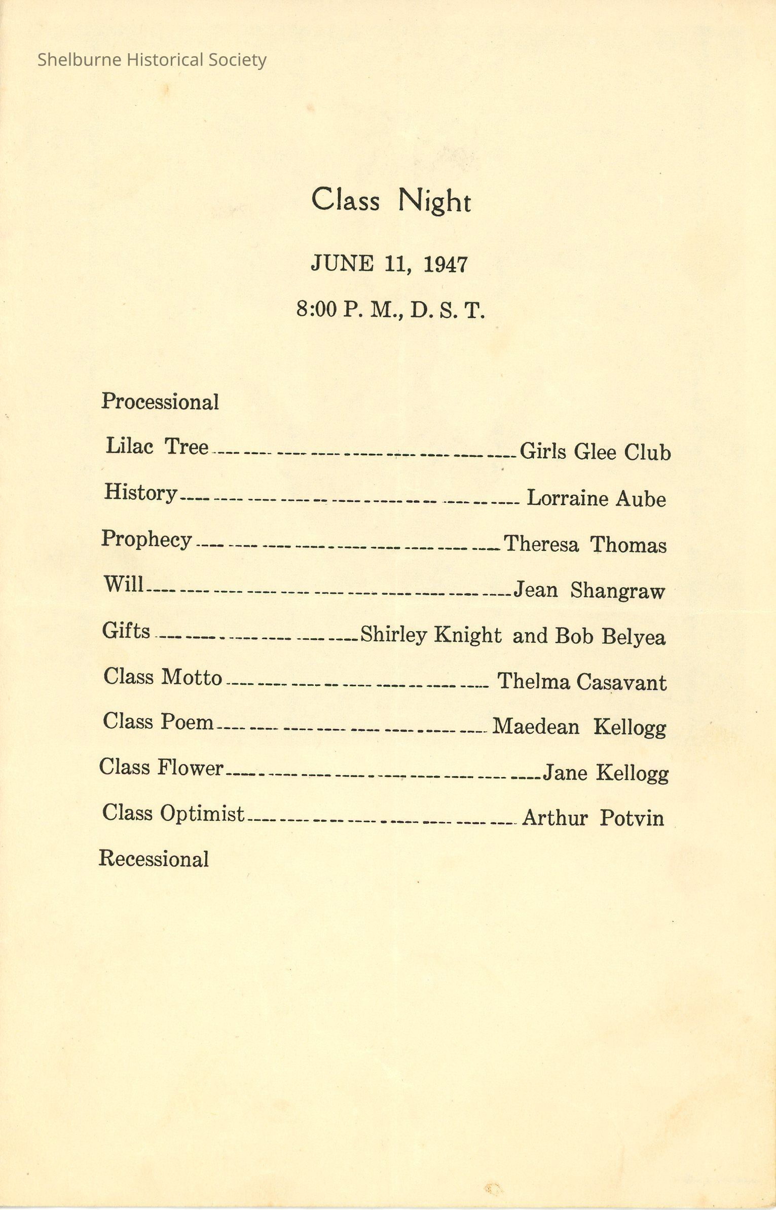 Shelburne High School Class Night 1947 ProgramEntry/Object ID