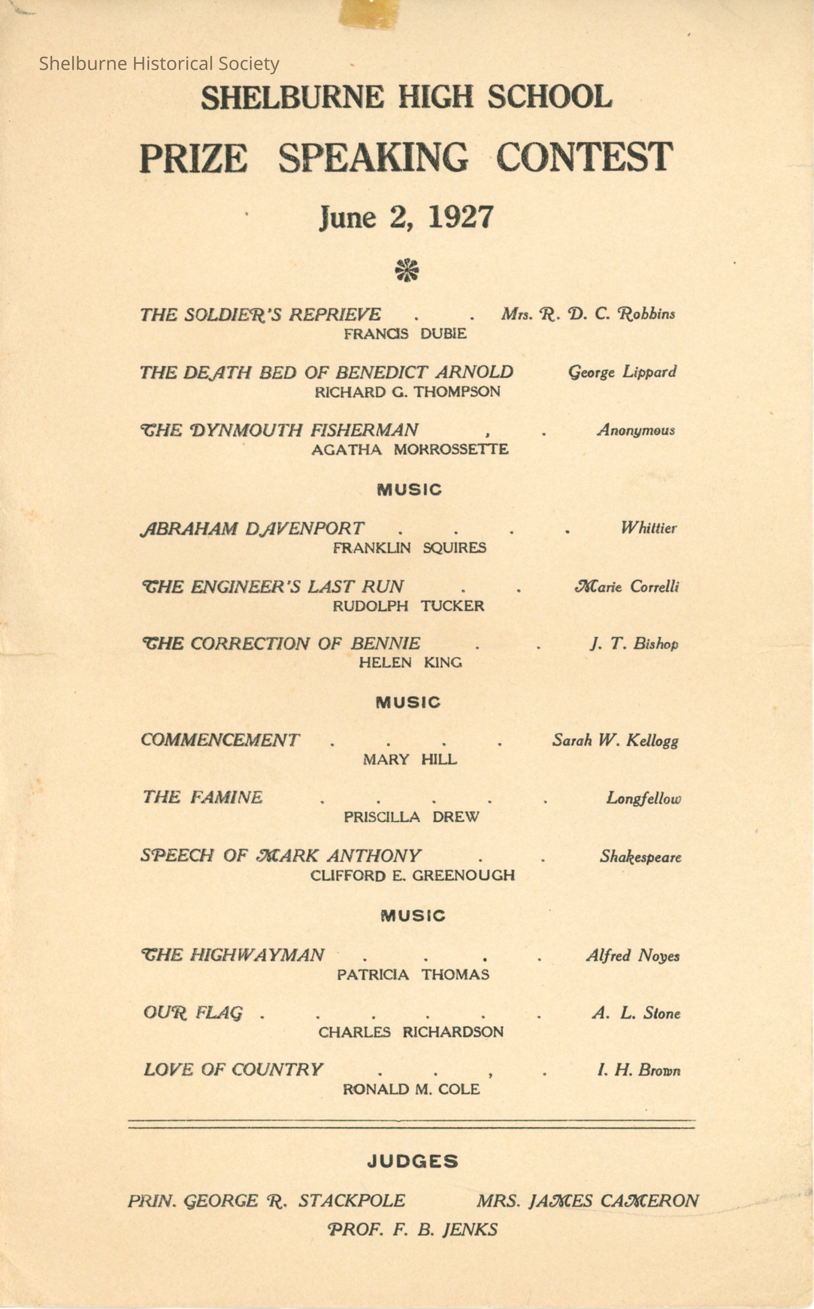 Shelburne High School Prize Speaking Contest Program 1927Entry/Object ID