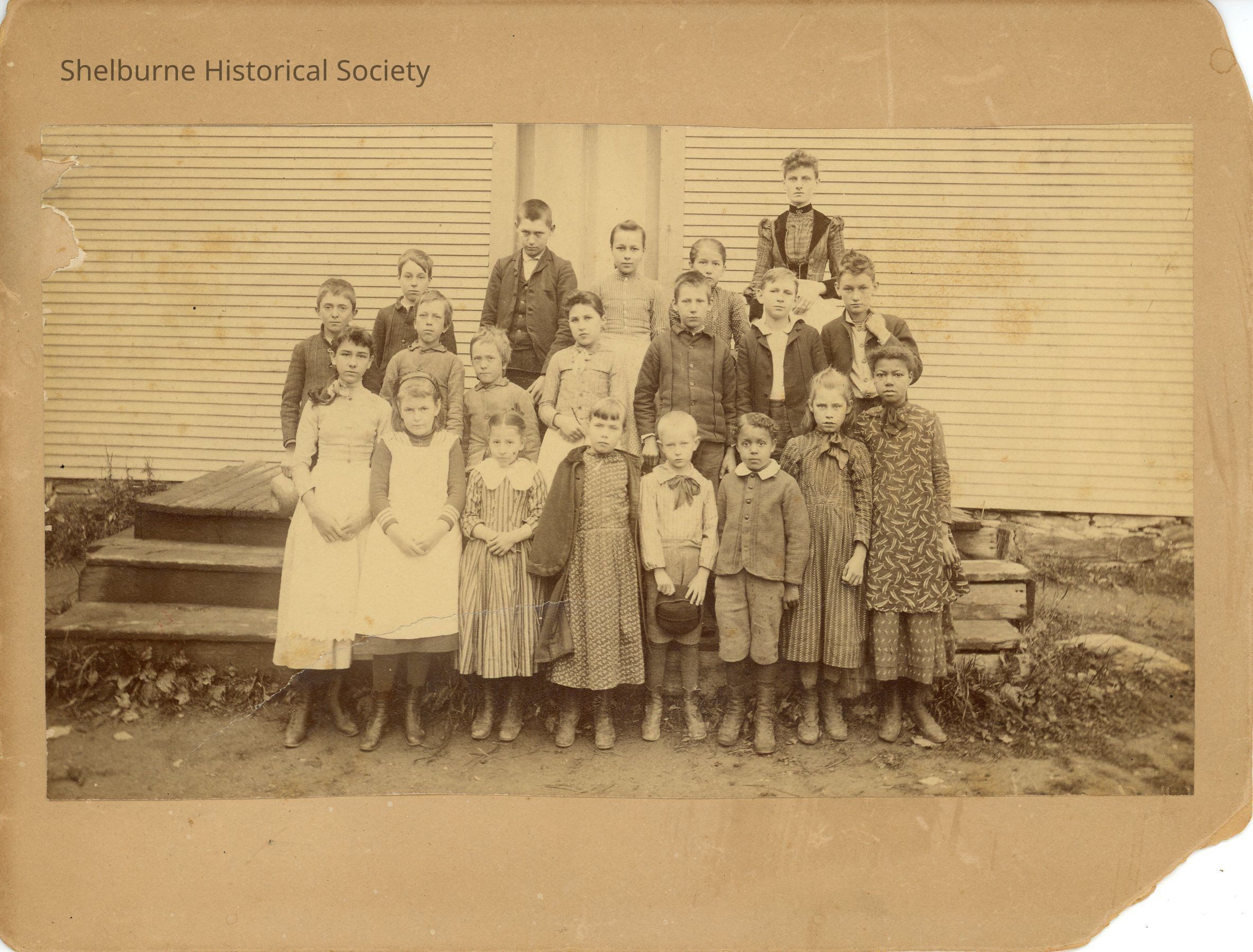 This is a group portrait presumably of the students and teacher of this school. This photo was in the collection of the Shelburne Historical Society and is presumed to be of a schoolhouse in Shelburne, Vermont.Subject Place