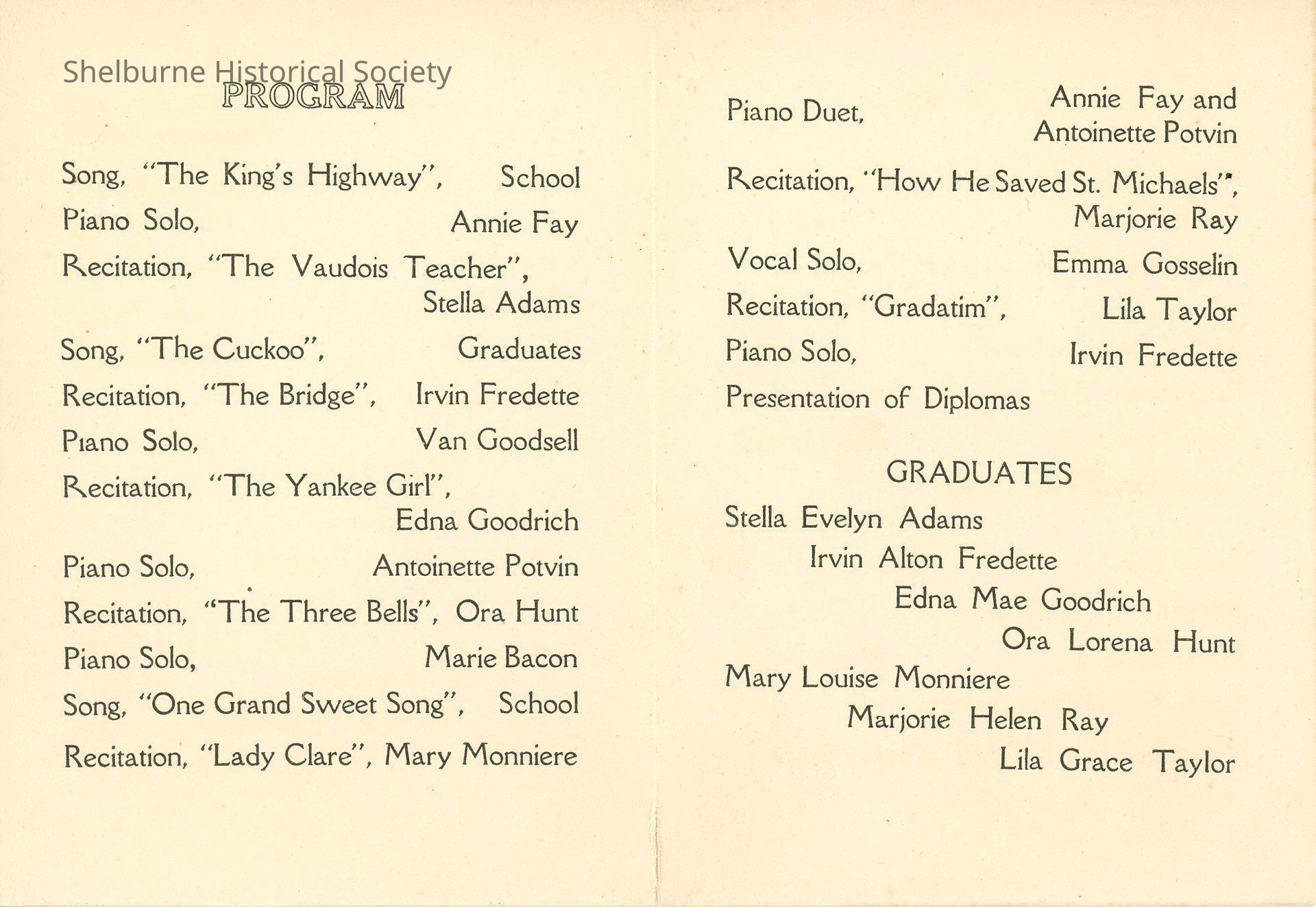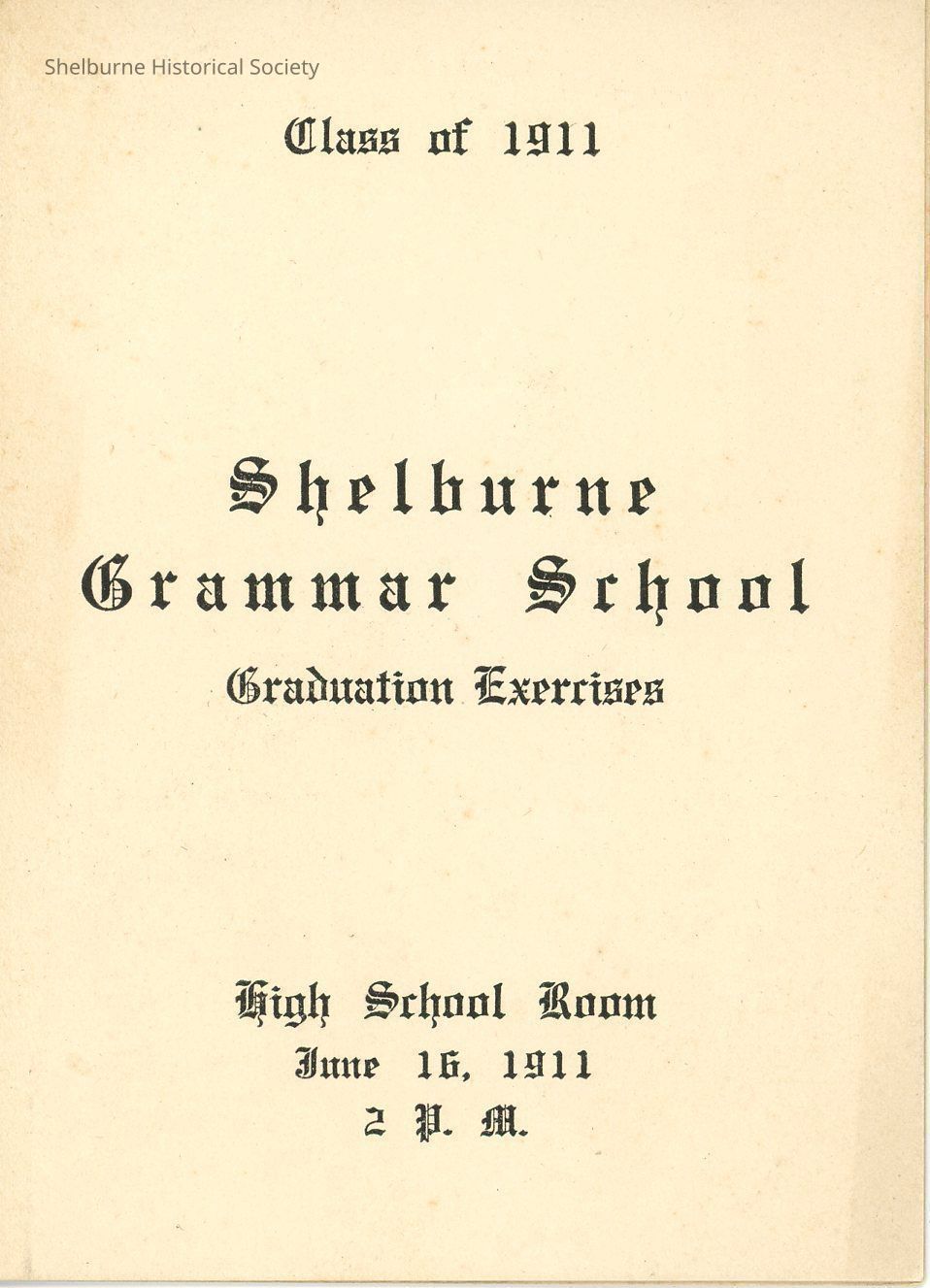 Shelburne Grammar School Graduation Exercise Program 1911