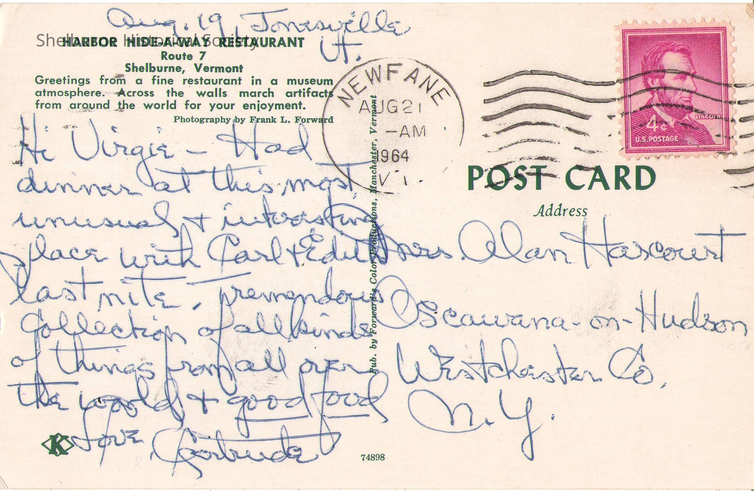 On the back of the postcard: "Aug. 19, Jonesville VT. Hi Virgie - Had dinner at this most unusual & interesting place with Carl & Edith last nite. Tremendous collection of all kinds of things from all over the world & GOOD FOOD Love, Gertrude".Lexicon