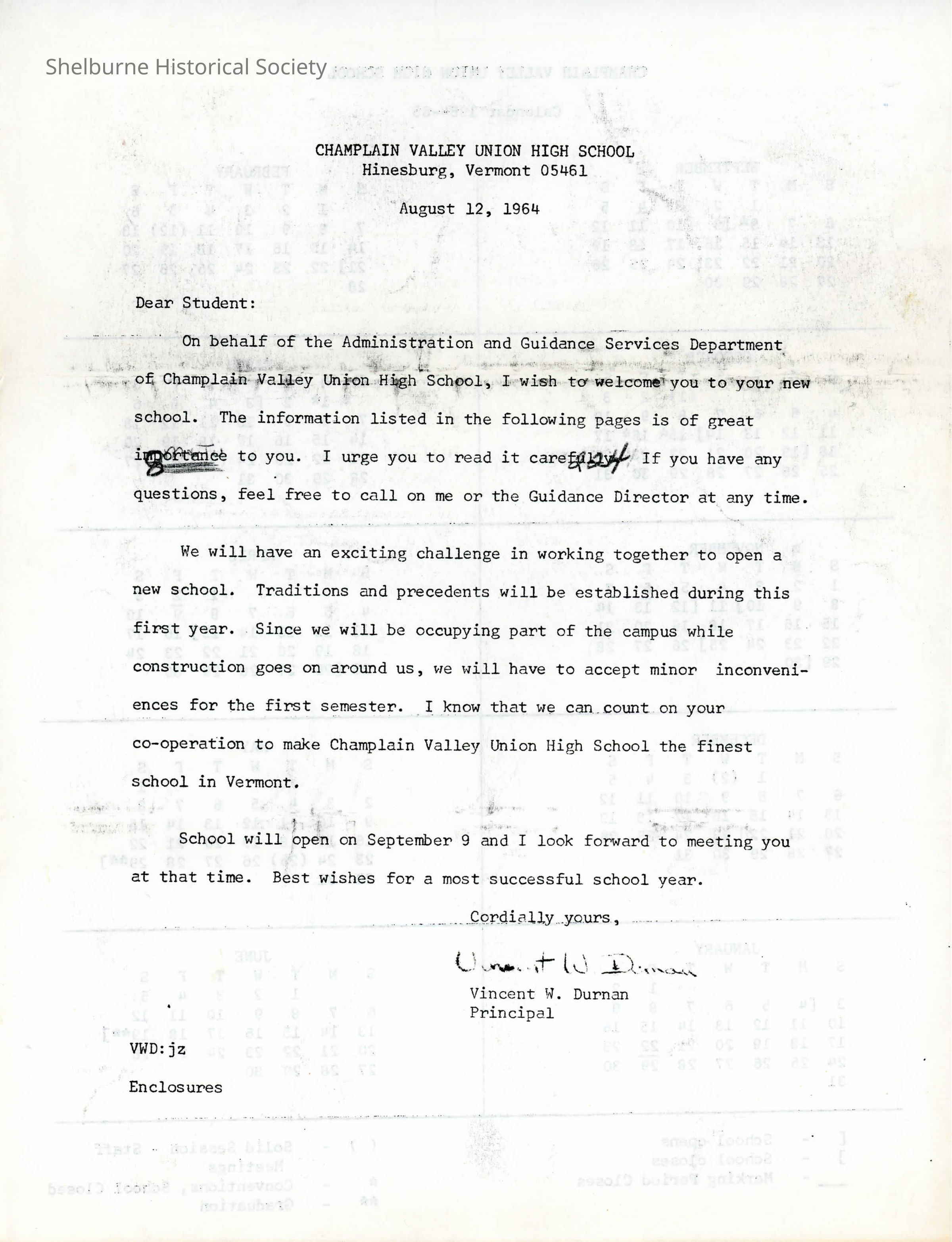 A letter to students of Champlain Valley Union High School Students August 12, 1964 welcoming them to the newly opened school.