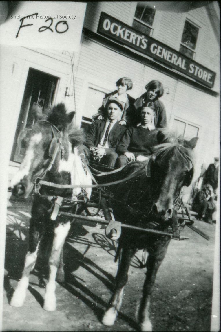 Children with pony cart in front of Ockert's General Store (currently the Shelburne Country Store). Cart and ponies from Shelburne Farms. Windfield Tower (driver), Hildreth Ranks (left), In back, Janet Ellen Tower and Catherine Wetson.Subject Person or Organization