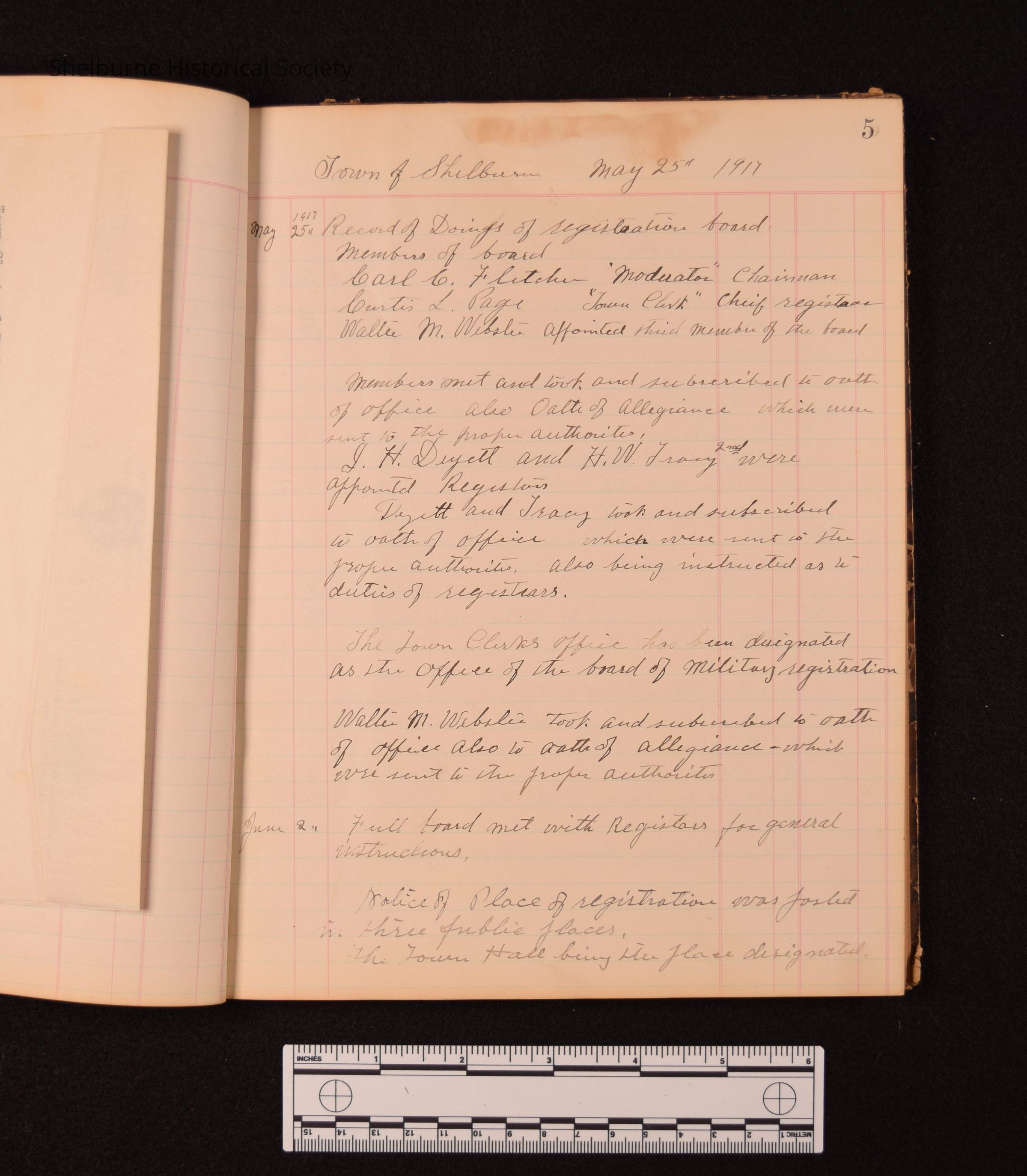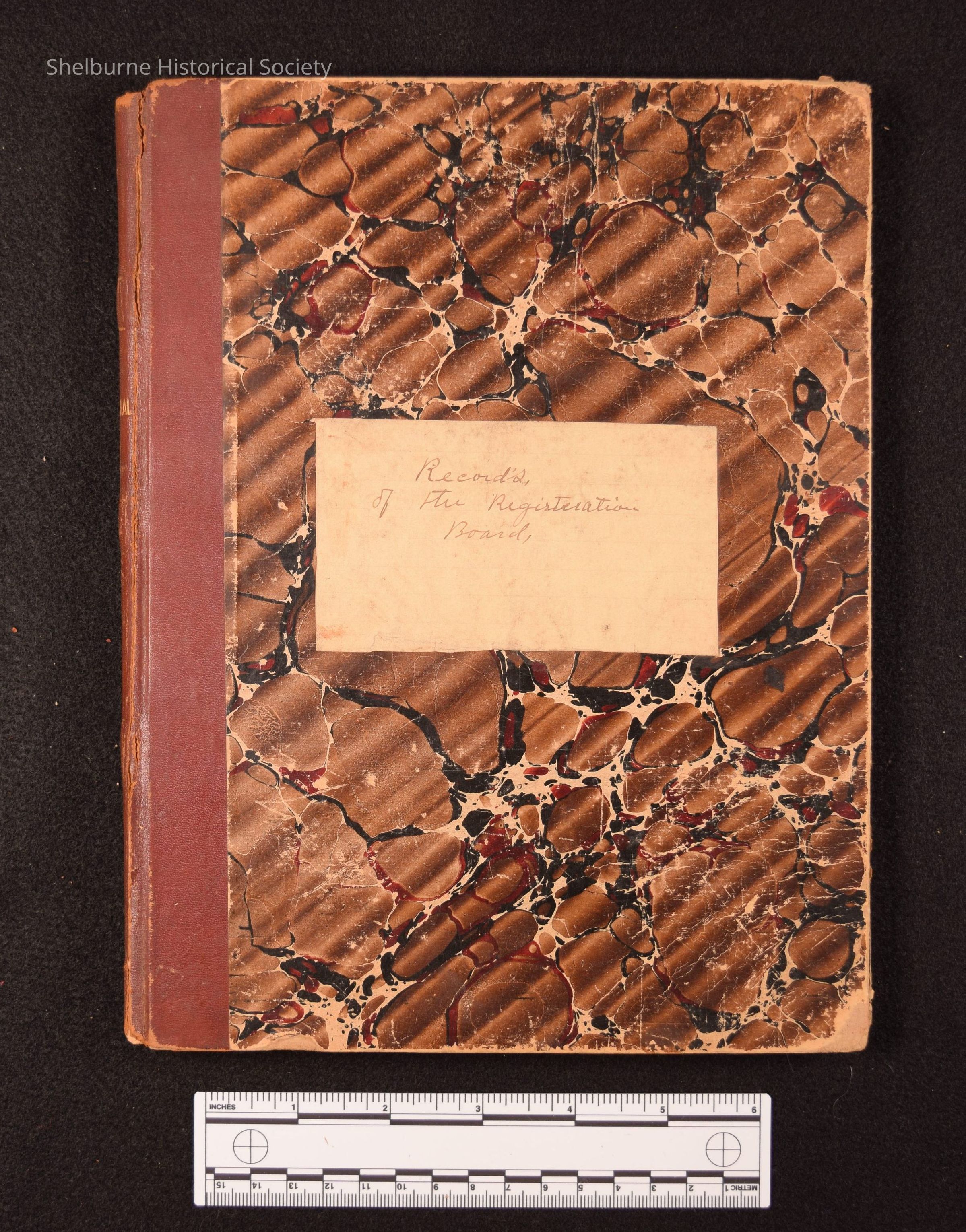 This record book with records dated May 25, 1917 contains information about Shelburne citizens, their affiliations and also a summary report of that information. A letter included in the book states: "Town Clerk of Shelburne, Shelburne, Vermont, Dear Sir: I am directed by Governor Graham to advise you that Walter M. Webster, Esquire has been appointed third member of the board of military registration of the town of Shelburne, for the purposes of the military registration, June fifth. ......"Lexicon