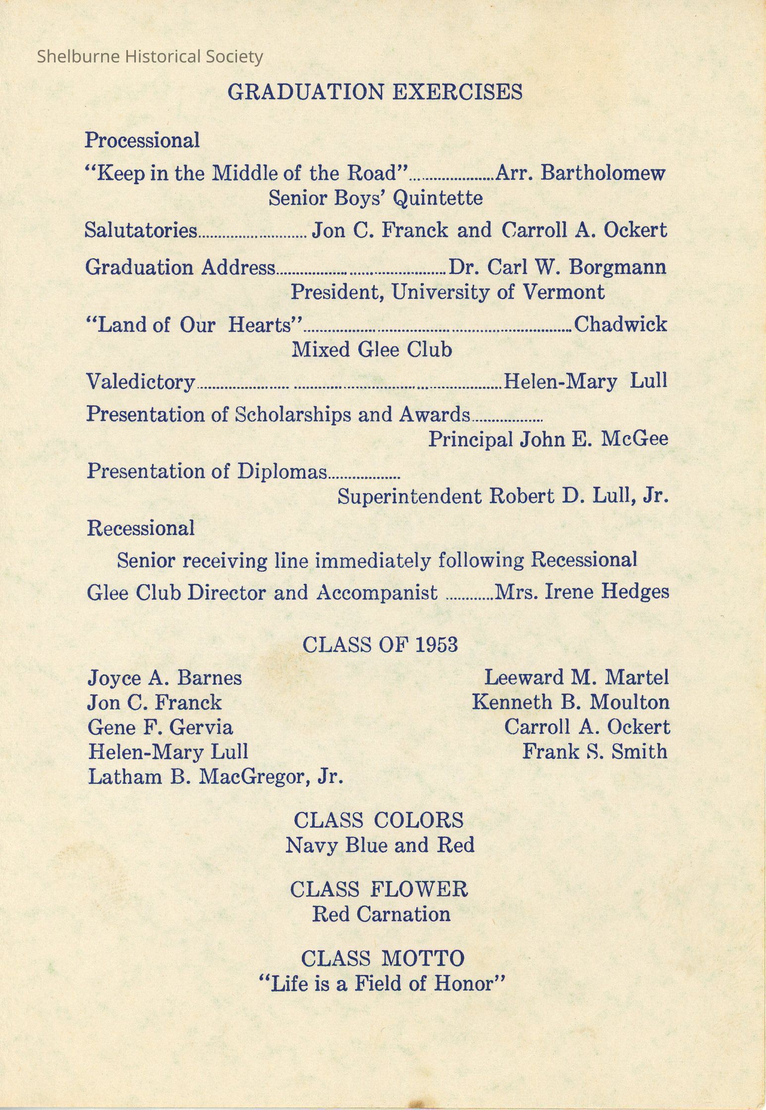Commencement Brochure Shelburne High School 18 June 1953Lexicon