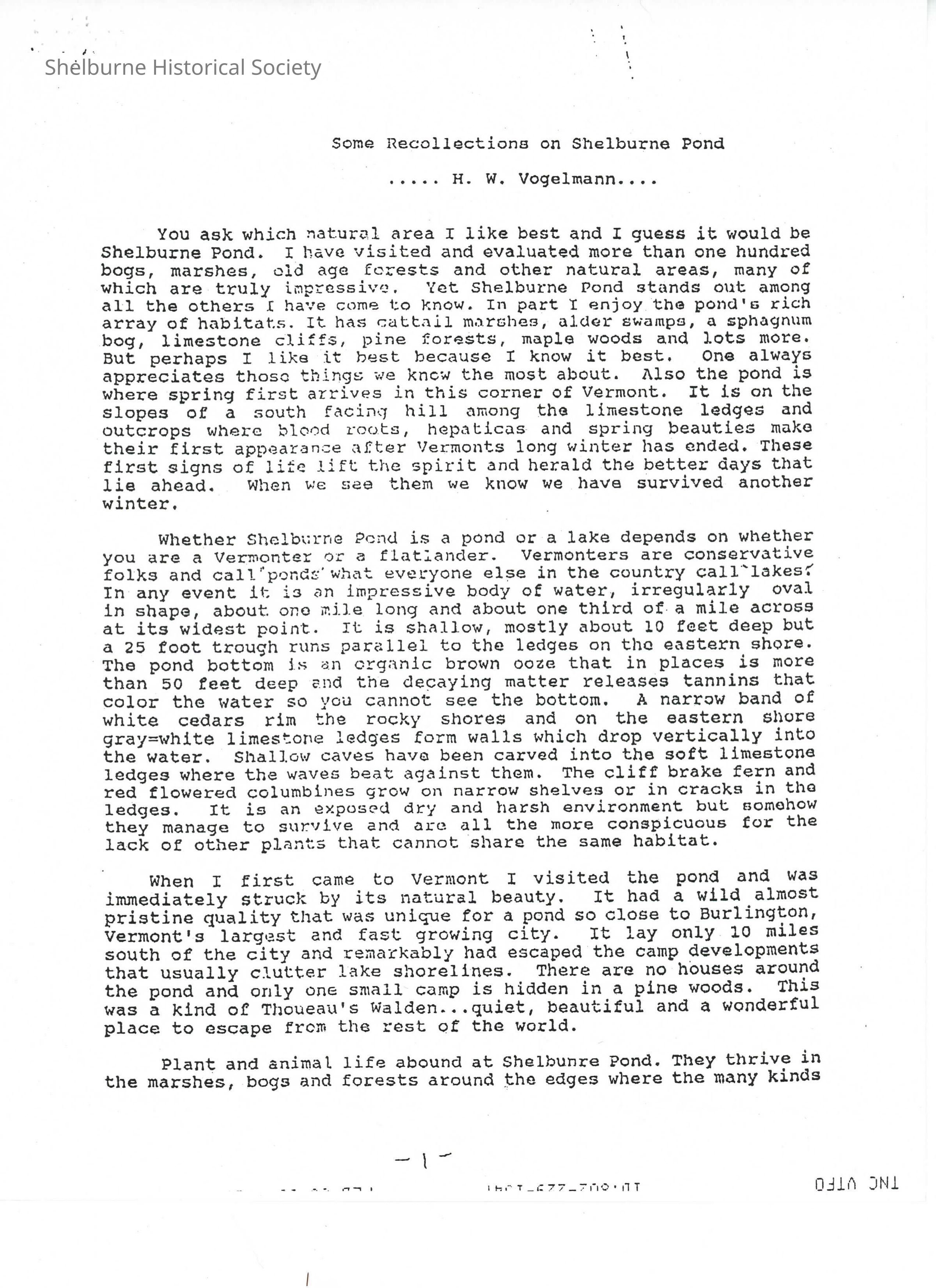 This is a photocopy of a 7 page fax communicated on 6 Feb 1995. TNC VTFO, also on the document I believe is 'The Nature Conservancy'. The document, written by H. Vogelmann, titled 'Some Recollections on Shelburne Pond', describes his experiences and extension natrual history knowledge about the Pond and also efforts by The Nature Conservancy to have the area around the pond conserved.Lexicon